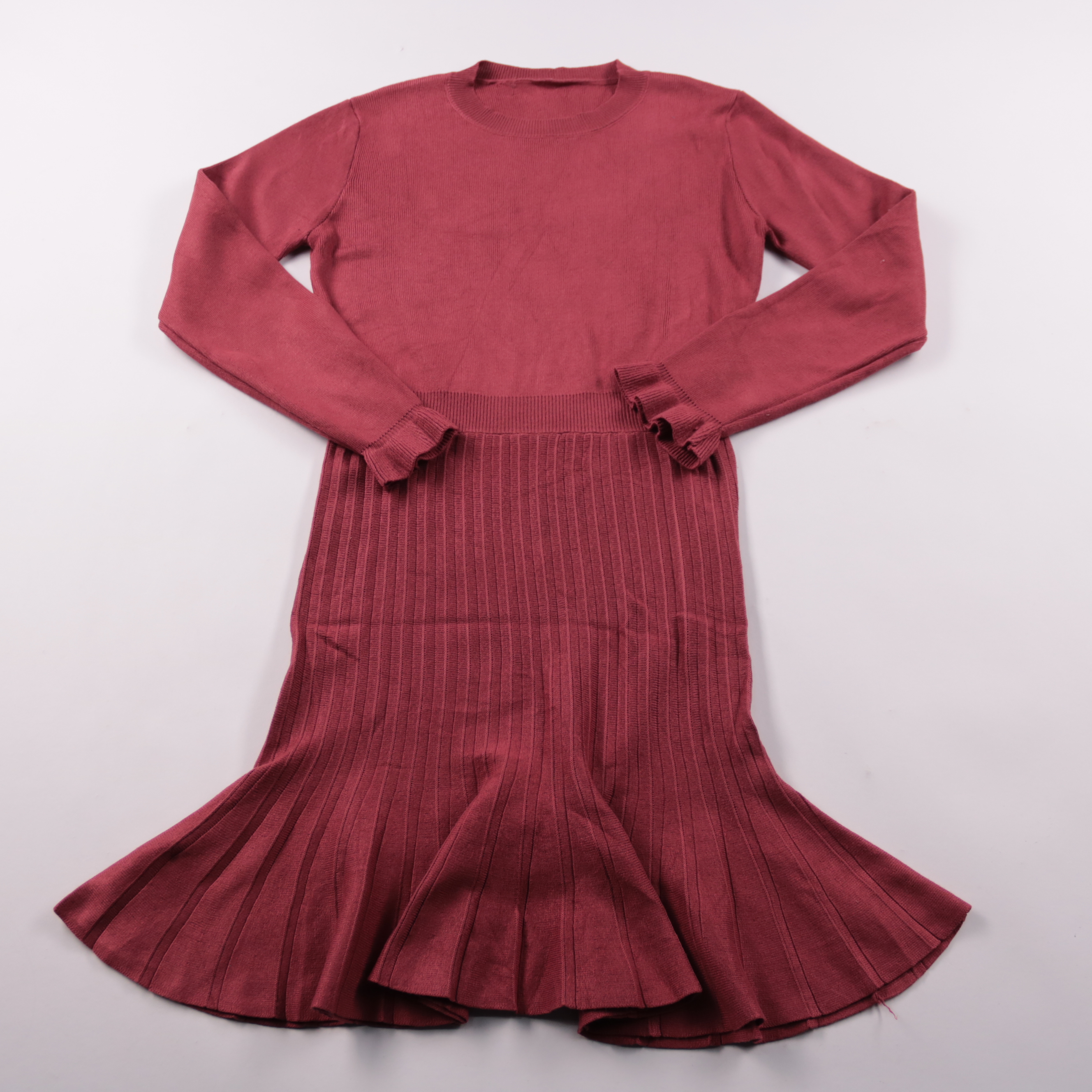 Трикотажное платье без указанного бренда в бордовом цвете, с длинным рукавом и расклешённым низом в рубчик. Подойдёт для повседневных образов в прохладную погоду — с ботинками, сапогами или кедами. Материал мягкий и эластичный, хорошо садится по фигуре...