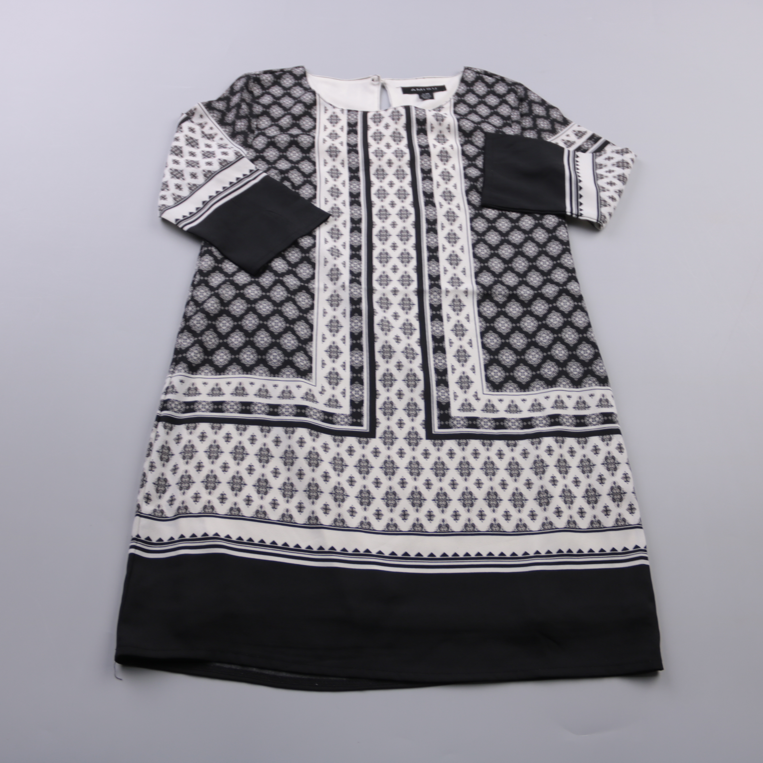 Повседневное платье Amisu прямого кроя с коротким рукавом и чёрно-белым орнаментальным принтом. Подойдёт для города, офиса или отдыха в тёплую погоду и легко сочетается с однотонной обувью и аксессуарами. Практичное преимущество — немаркая расцветка и ...