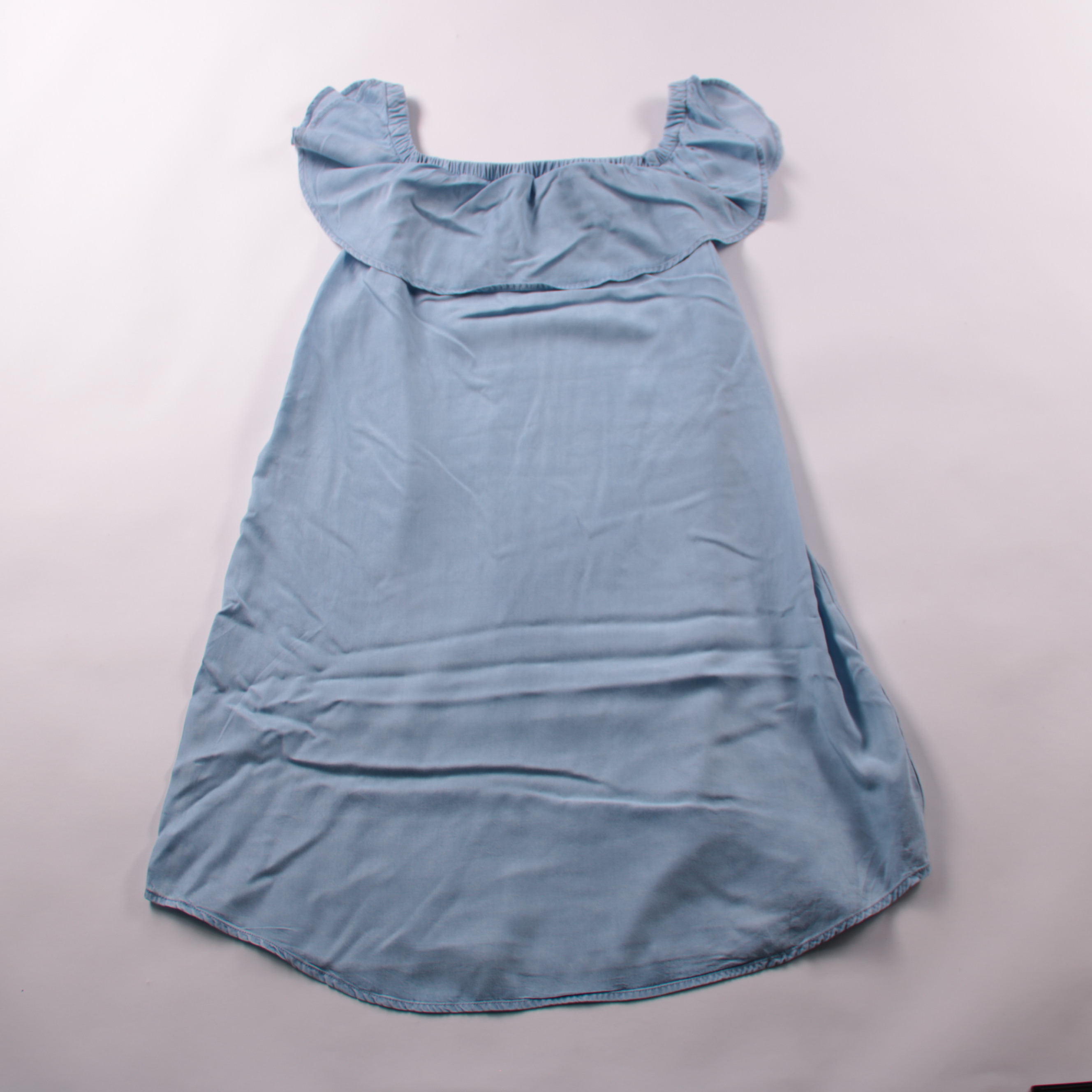 Лёгкое голубое платье H&M с открытыми плечами и широкой оборкой по верхнему краю. Подойдёт для лета, отпуска и прогулок в тёплую погоду. Ткань из 100% лиоцелла приятная к телу и хорошо дышит.