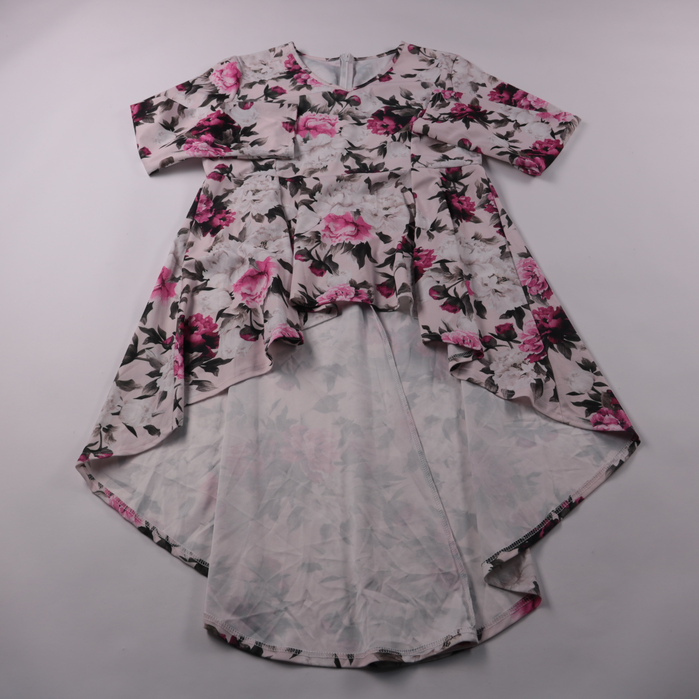 Женское платье Shein Curve с цветочным принтом и асимметричным подолом, рукав 3/4. Подойдёт для повседневных выходов и летних прогулок, легко сочетается с кедами или босоножками. Ткань тянется за счёт эластана и комфортно садится по фигуре.