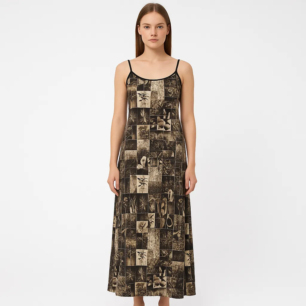 Повседневное платье-комбинация Black Friday на тонких бретелях, длина миди, с принтом «пэчворк» в чёрно-бежевой гамме. Подойдёт для лета и отпусков, можно носить с кедами или босоножками. Лёгкий материал с эластаном хорошо тянется и быстро сохнет.