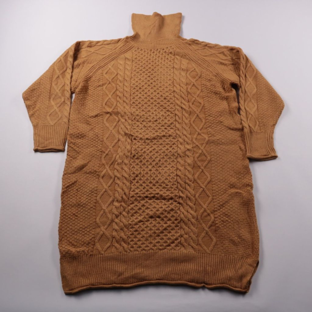 Вязаное платье-свитер Hema в тёплом коричневом оттенке с высоким воротником и узором «косы». Подойдёт для повседневной носки в прохладную погоду, удобно сочетается с ботильонами или сапогами. Плотная вязка хорошо сохраняет тепло и не требует сложного у...