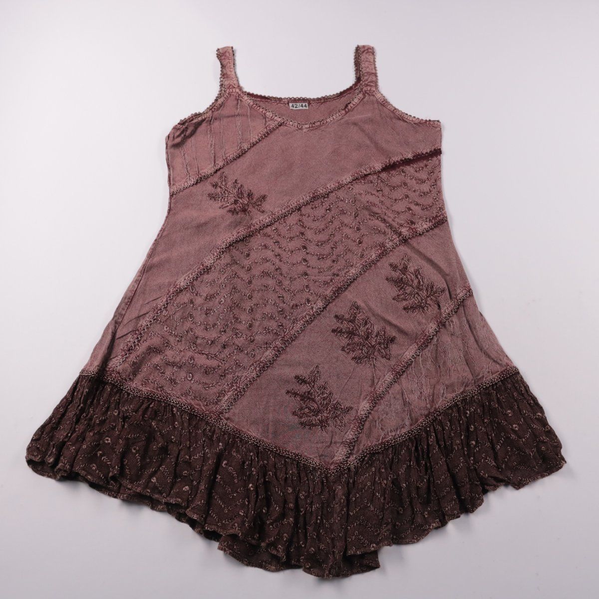Женское повседневное платье-сарафан без бренда, размер 42/44, из 100% вискозы. Модель на бретелях с декоративными вставками и вышивкой, хорошо подойдёт для тёплой погоды и отдыха. Лёгкая ткань дышит и комфортно носится в течение дня.