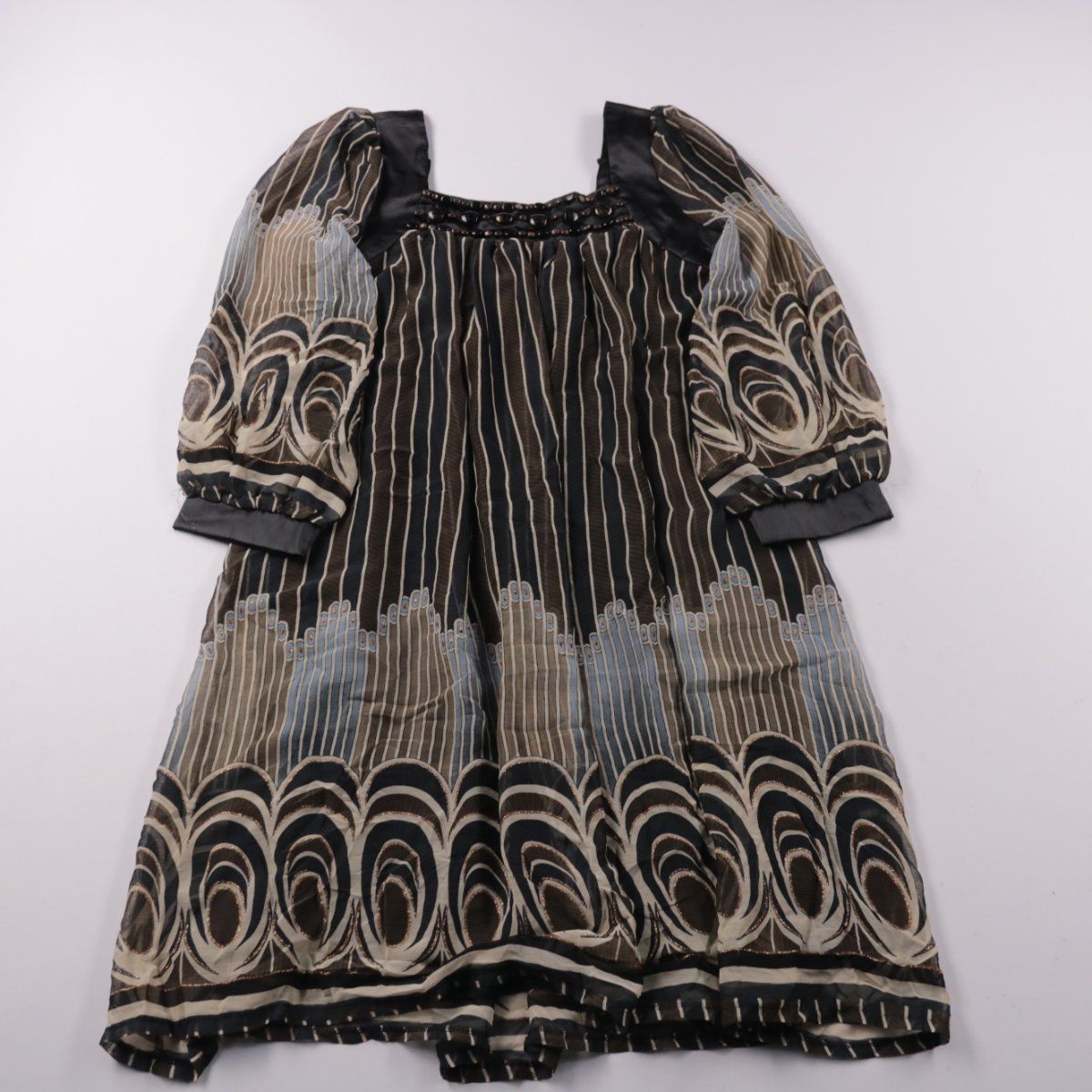 Женское повседневное платье из полиэстера с пышными рукавами и контрастным узором в полоску. Подойдёт для прогулок и повседневных образов, можно сочетать с плотными колготками и жакетом. Лёгкая ткань быстро сохнет и проста в уходе.