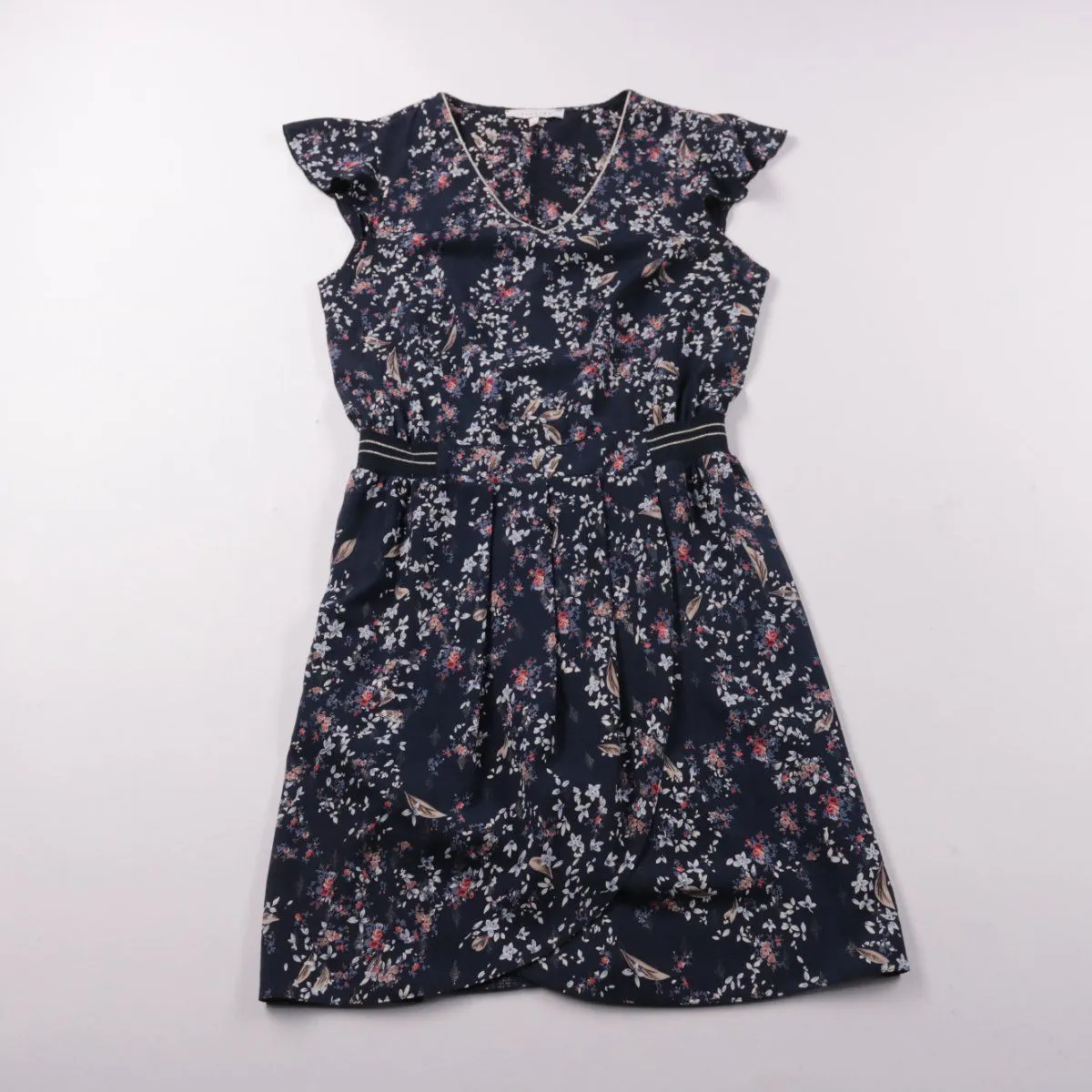 Платье LolaLiza тёмно-синего цвета с мелким цветочным принтом и V‑образным вырезом, с короткими рукавами-крылышками. Подойдёт для повседневных выходов и прогулок в тёплую погоду, пояс на талии делает силуэт более собранным. Лёгкая ткань проста в уходе и удобна на каждый день.