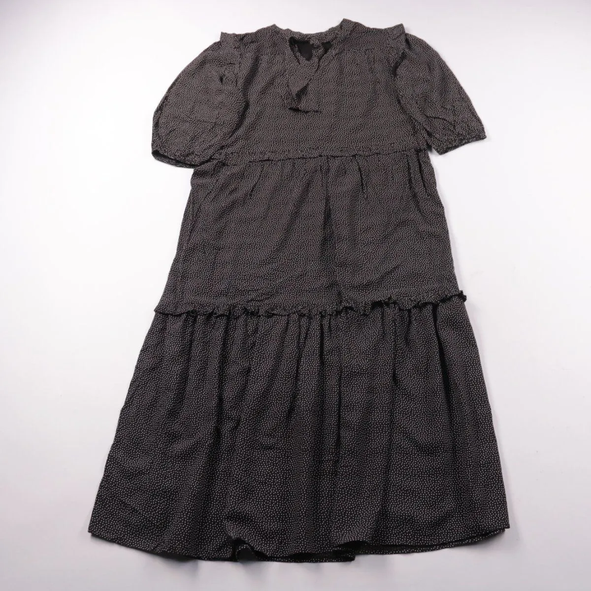 Повседневное платье George с ярусной юбкой, короткими рукавами и мелким принтом в горох. Подойдёт для летних прогулок и повседневной носки. Лёгкая вискозная ткань хорошо драпируется и комфортна в тёплую погоду.