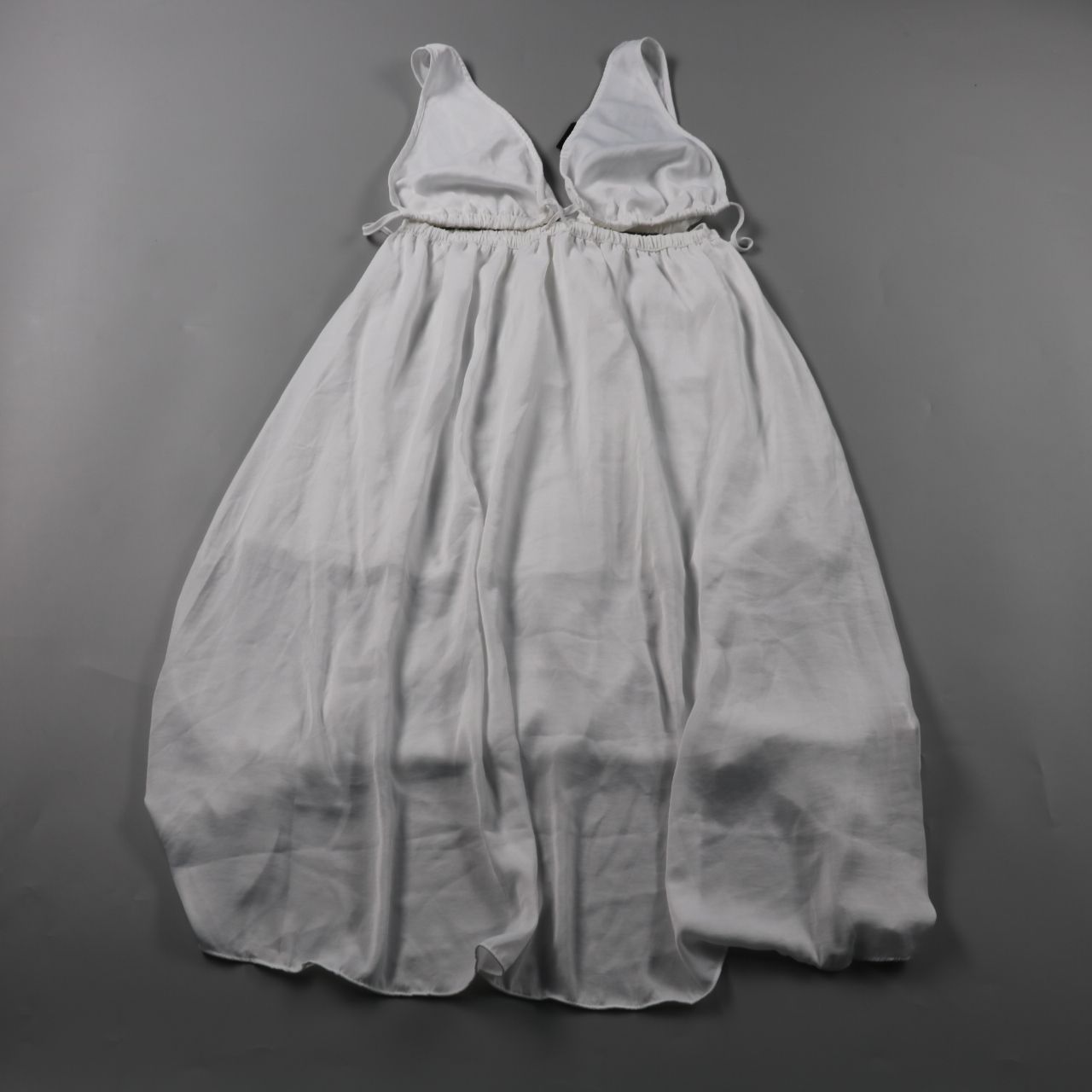 Белое платье Rebecca Minkoff с бретелями и вырезами (cut-out) в зоне талии и мягкой сборкой под грудью. Подойдёт для летних прогулок и отпуска, хорошо сочетается с сандалиями или кедами. Лёгкий полиэстер быстро сохнет и не требует сложного ухода.