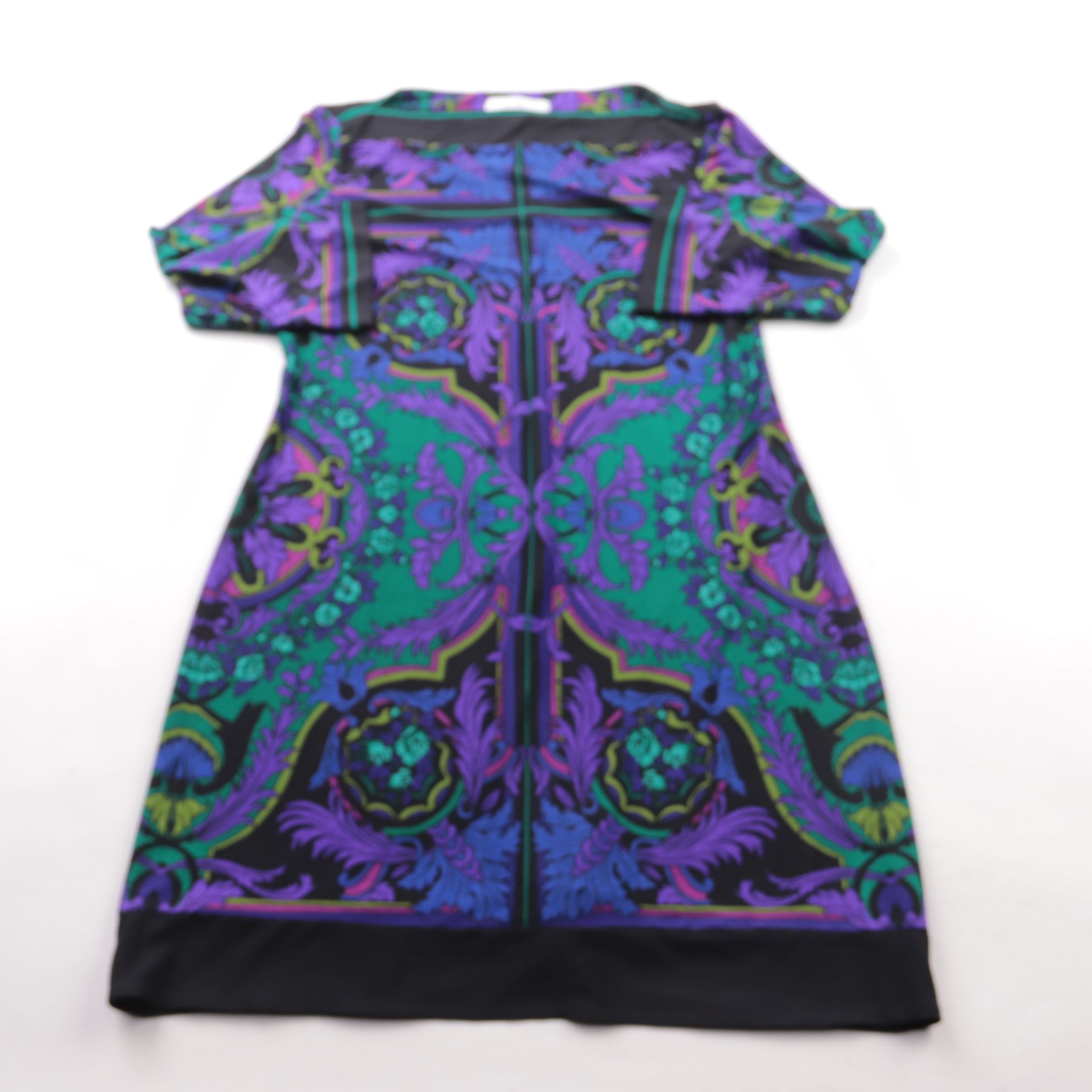 Повседневное платье Wallis Petite с коротким рукавом и ярким орнаментальным принтом в фиолетово‑зелёных тонах. Подойдёт для летних прогулок и офиса без строгого дресс-кода. Ткань с эластаном слегка тянется и комфортно садится по фигуре.