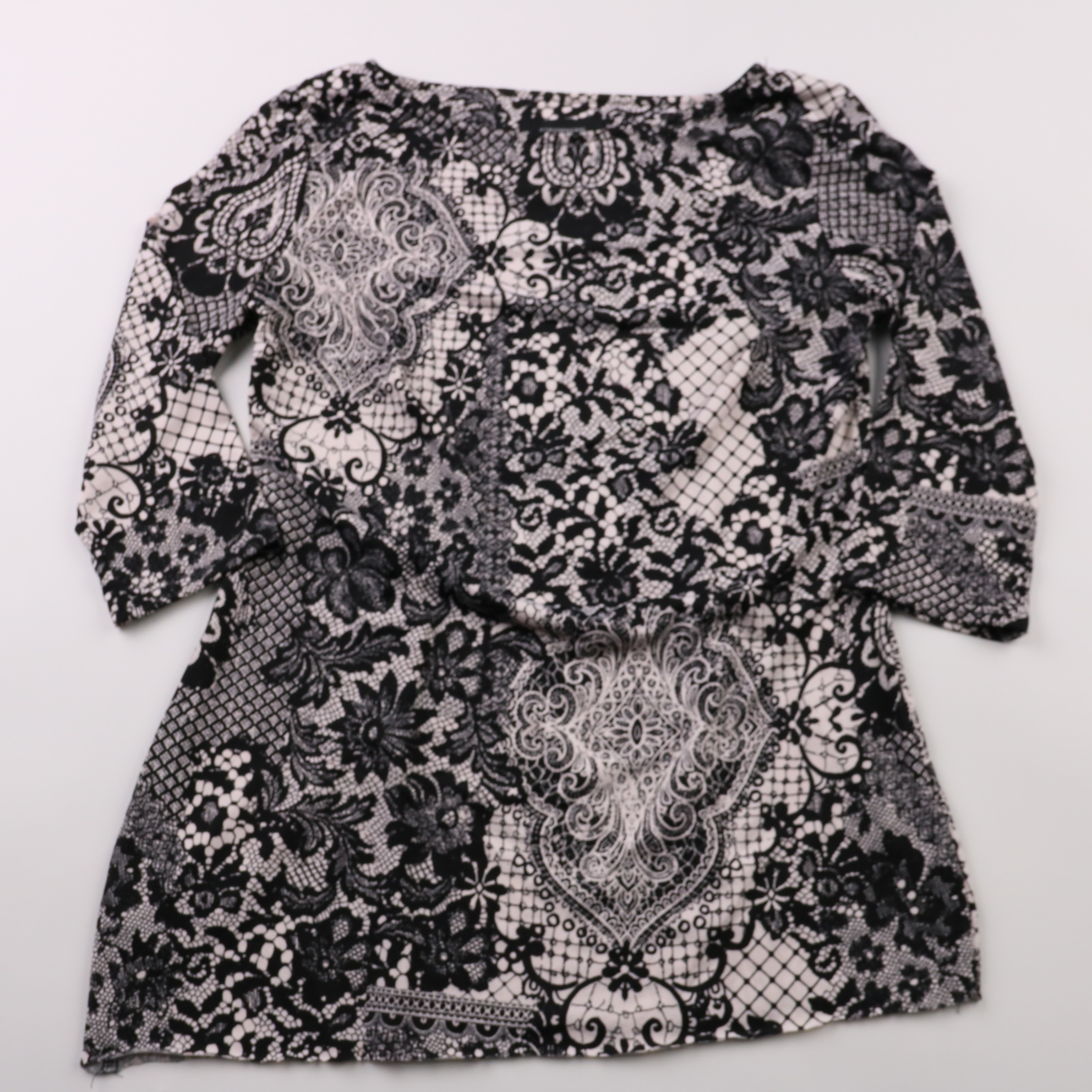 Женская блузка Atmosphere с выразительным чёрно-белым кружевным принтом и рукавом 3/4. Подойдёт для офиса или выходов в сочетании с однотонными брюками/юбкой. Практичная ткань не требует сложного ухода и хорошо комбинируется с базовыми вещами.