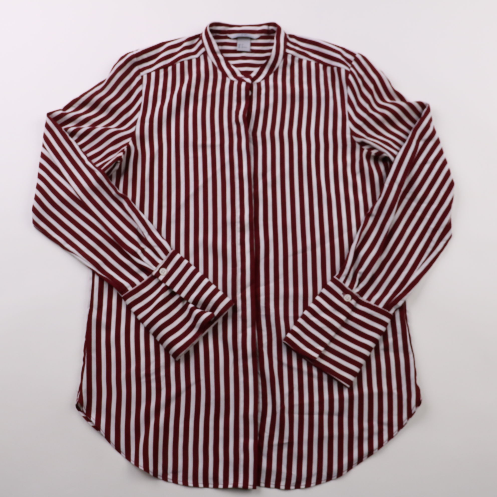Женская блузка H&M в бордово-белую вертикальную полоску, с воротником-стойкой и длинным рукавом на манжете. Подойдёт для офиса и повседневных образов с джинсами или брюками. Лёгкая ткань и классический принт делают её удобной для носки в течение дня.