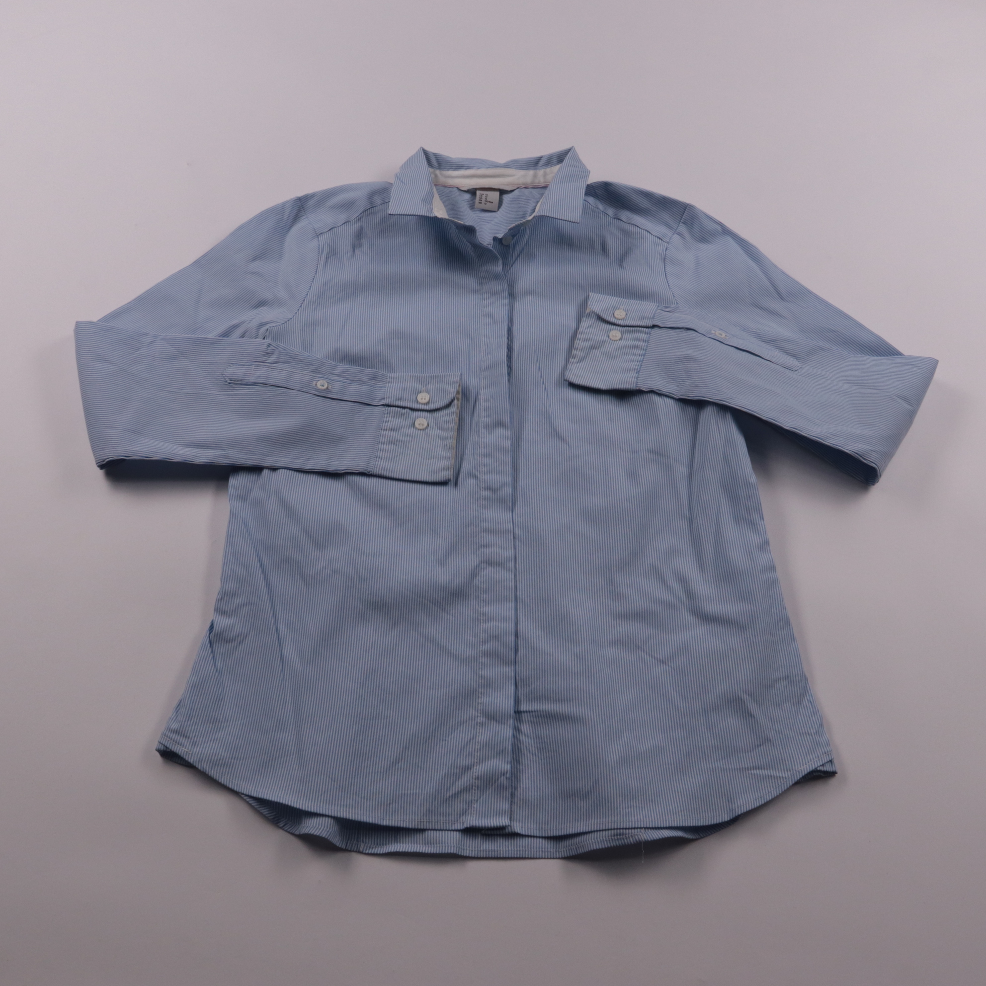 Женская рубашка H&M в голубую полоску с длинным рукавом и классическим воротником. Подойдёт для офиса и повседневных образов с джинсами или брюками. Ткань с добавлением эластана меньше мнётся и комфортно садится по фигуре.