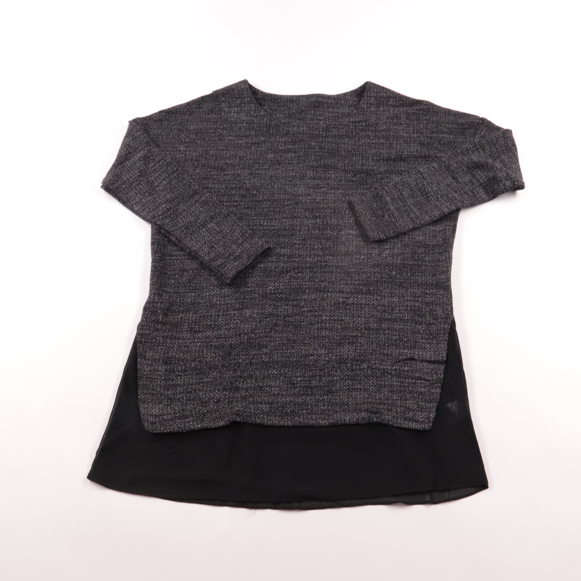 Женская блузка в чёрном цвете с длинным рукавом и контрастной вставкой по низу. Подойдёт для офиса и повседневных образов в демисезон, хорошо сочетается с брюками и юбками. Практичный плюс — ткань с эластаном слегка тянется и комфортно садится по фигуре.