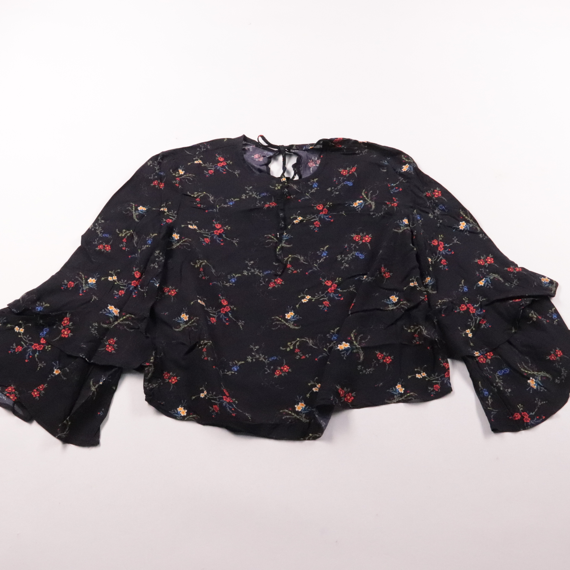 Блузка с цветочным принтом на тёмной основе, с завязкой у горловины и длинными рукавами. Подойдёт для офиса и на каждый день с джинсами или юбкой, смотрится аккуратно и женственно. Вискоза приятна к телу и хорошо драпируется.