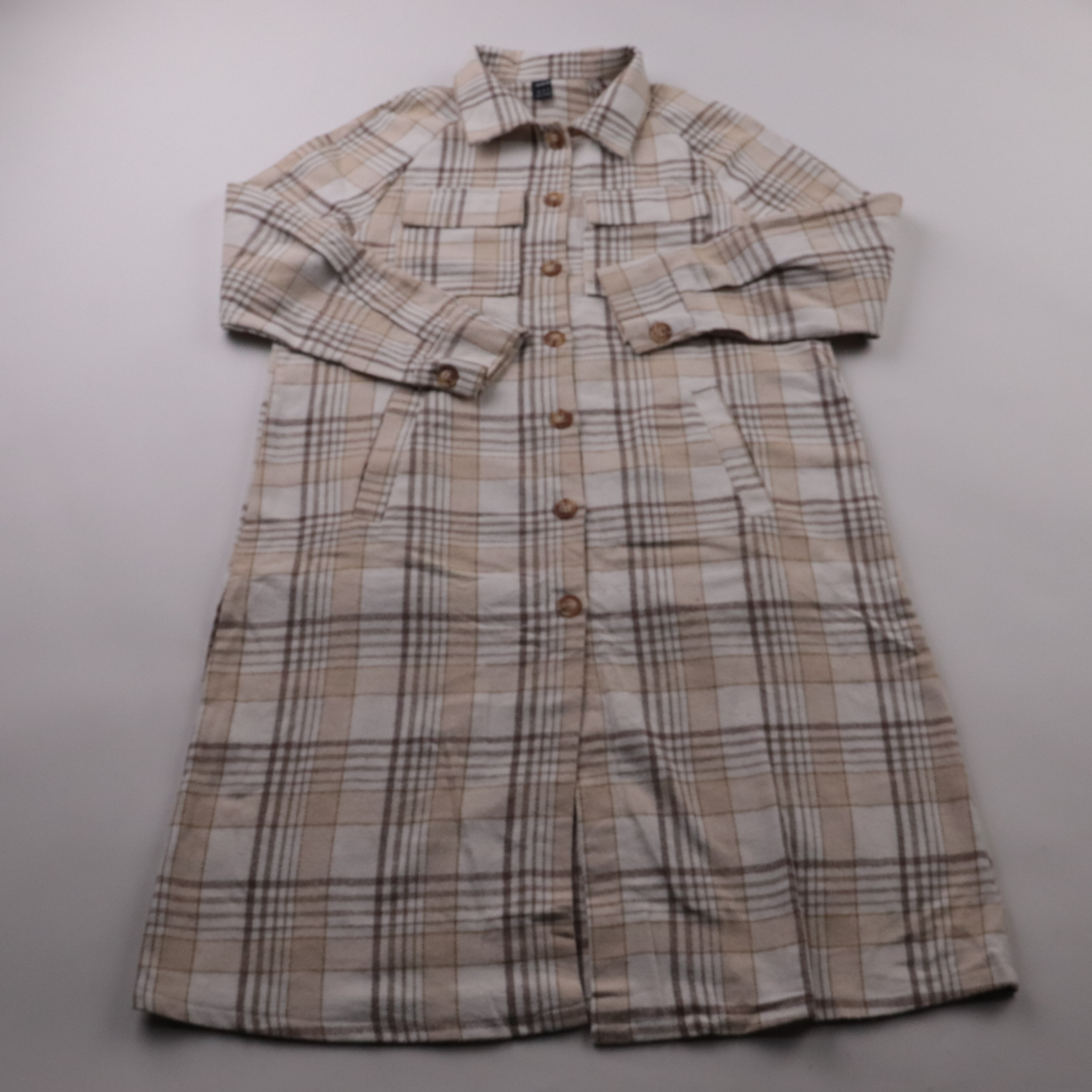 Рубашка-туника Shein в бежевую клетку, на пуговицах, с длинным рукавом и накладными карманами. Подойдёт для повседневных образов в межсезонье — можно носить как рубашку или как лёгкую накидку. Практична тем, что легко сочетается с джинсами и однотонным...