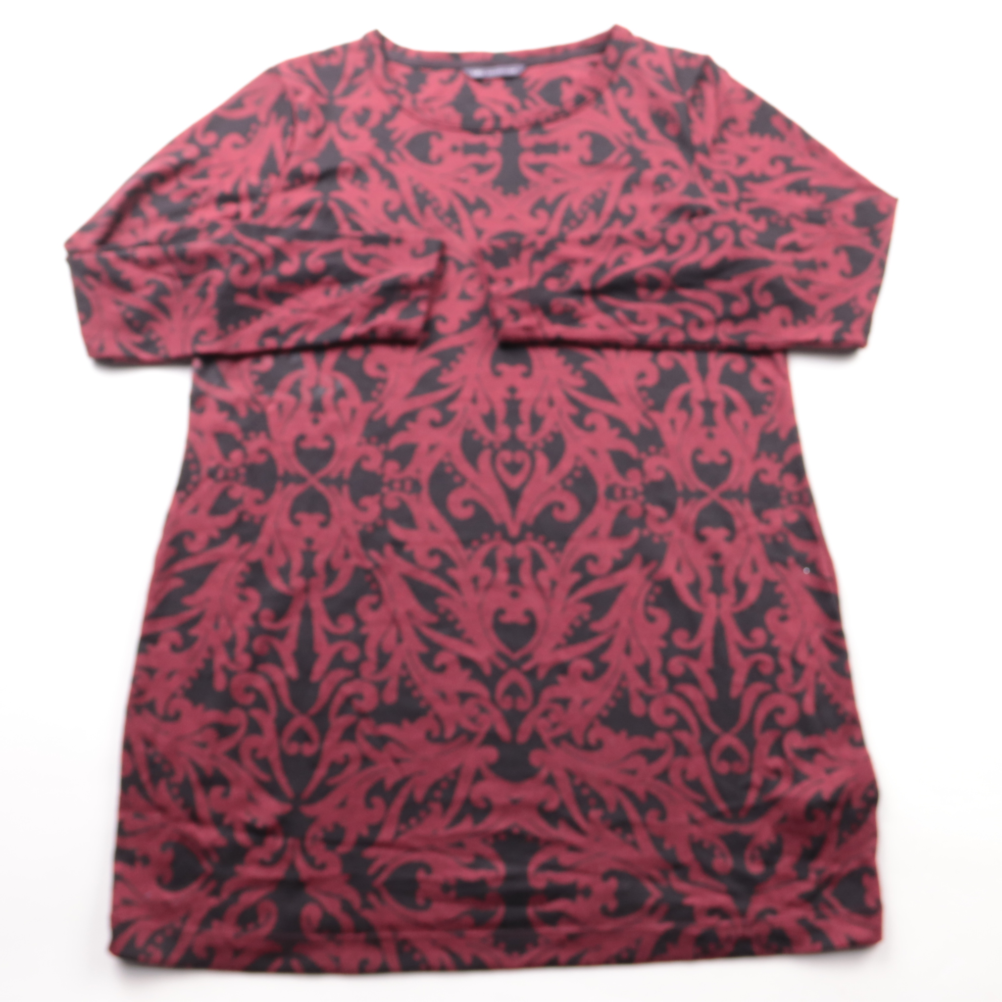 Туника M&S Collection бордово-чёрного цвета с орнаментальным принтом и рукавом 3/4. Подойдёт для повседневных образов и офиса, хорошо сочетается с брюками и легинсами. Трикотаж с эластаном тянется и комфортно сидит.