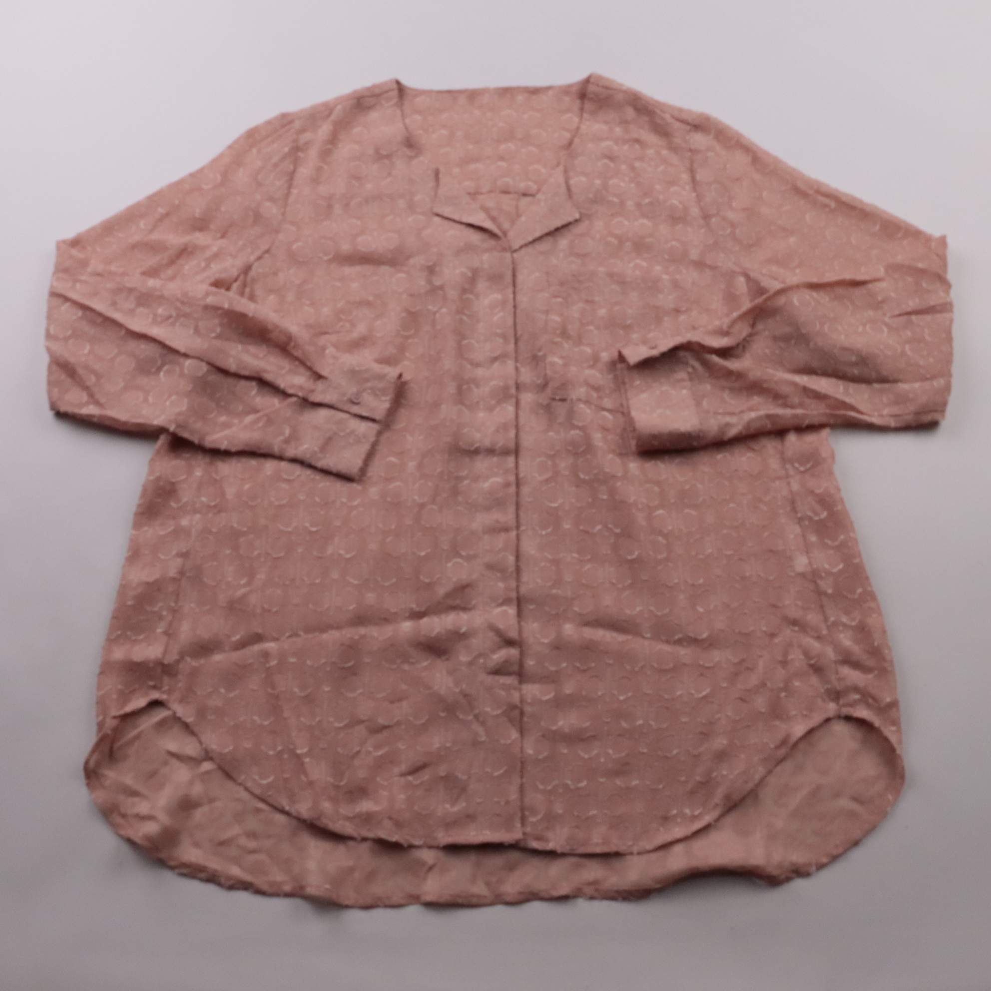 Пудрово-розовая блузка из лёгкой ткани с фактурным узором и длинным рукавом. Подойдёт для офиса и повседневных образов, хорошо смотрится с брюками или юбкой. Ткань тонкая и комфортная, блузку удобно носить под жакет.