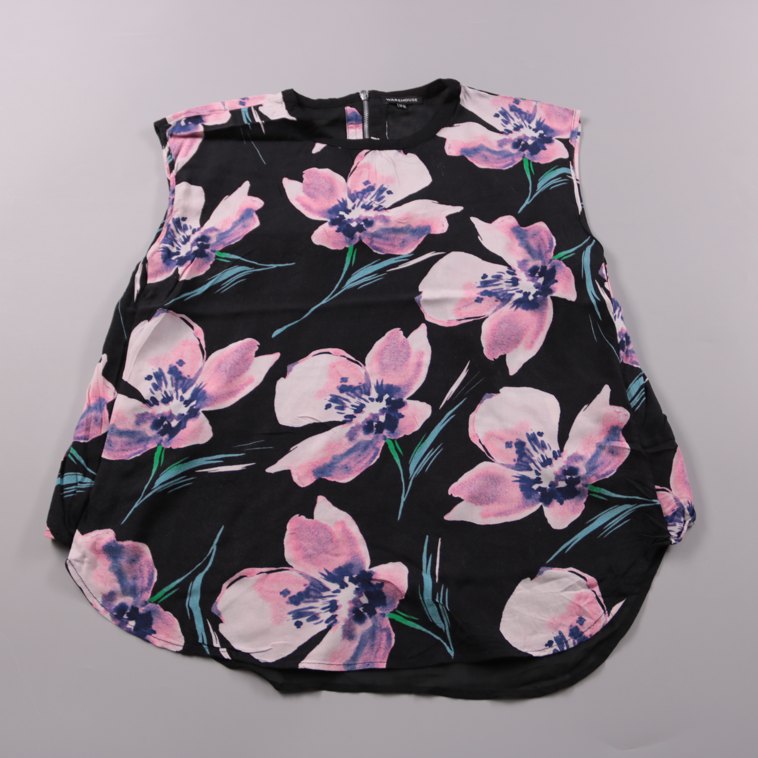 Женская блузка Warehouse без рукавов, чёрного цвета с крупным цветочным принтом и застёжкой на молнию сзади. Подойдёт для лета и тёплой погоды — можно носить с джинсами, юбкой или брюками. Ткань лёгкая и не стесняет движений, удобно для повседневных вы...