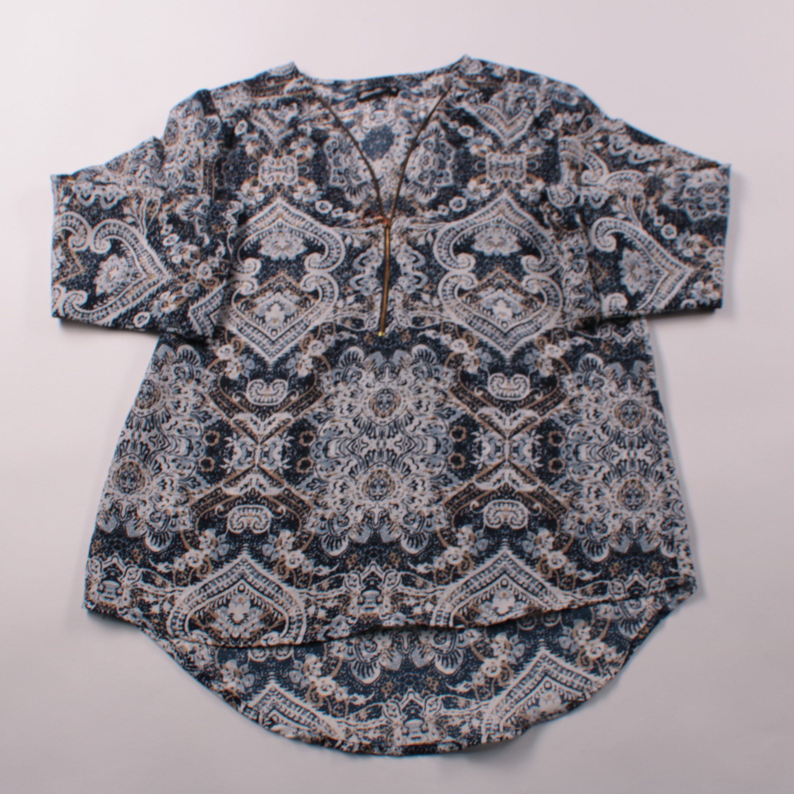 Блузка Miss Mello с орнаментальным принтом в сине-бежевых тонах и коротким рукавом. Подойдёт для повседневных образов и офиса в сочетании с однотонными брюками или джинсами. Лёгкая ткань комфортна в течение дня и не сковывает движения.