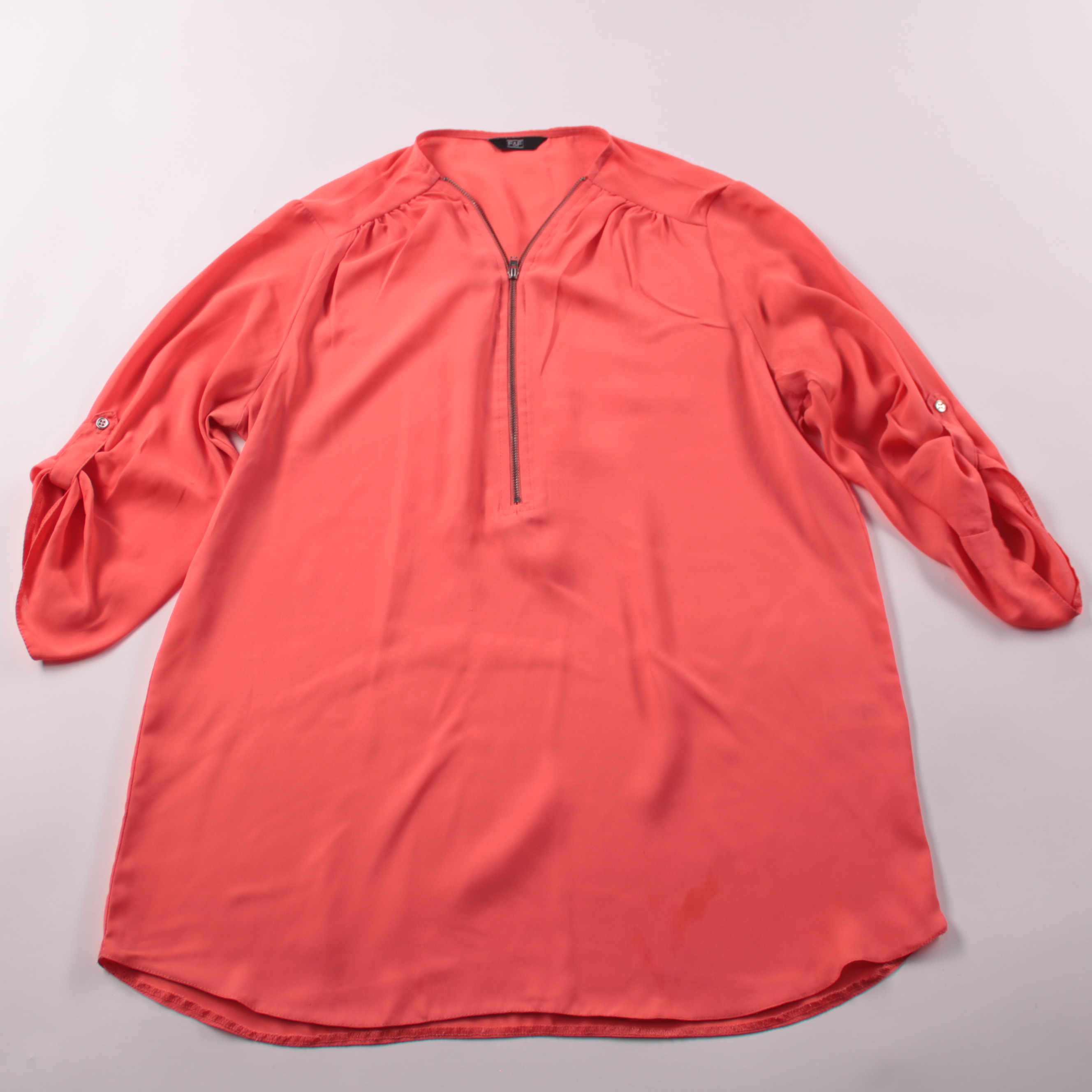 Женская блузка F&F кораллового цвета с молнией у горловины и мягкой драпировкой по линии плеч. Подойдёт для офиса и на каждый день, хорошо смотрится с джинсами или классическими брюками. Лёгкая ткань комфортно носится и быстро сохнет после стирки.