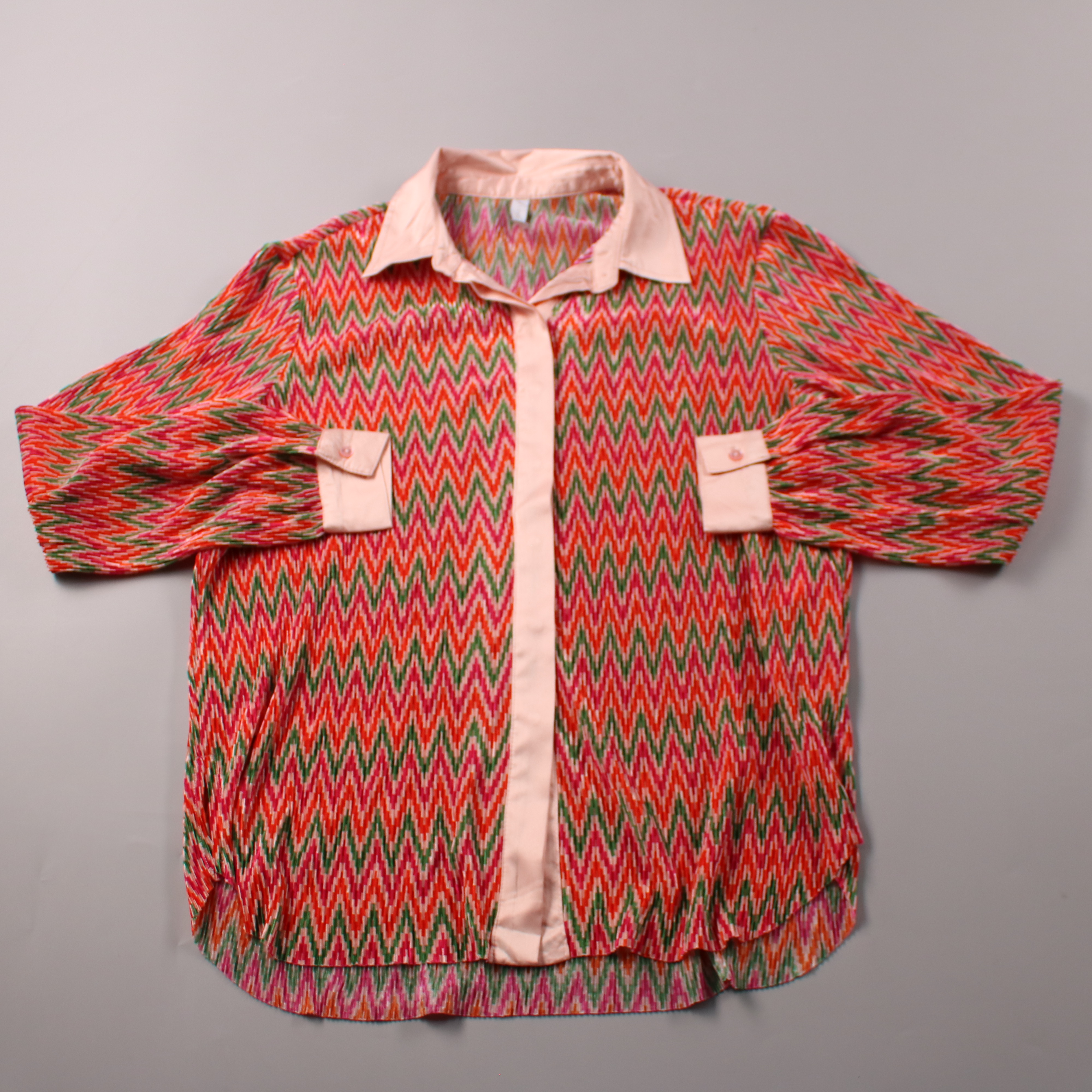 Блузка Amisu с ярким зигзагообразным принтом и контрастной планкой, воротником и нагрудными карманами. Подойдёт для летних прогулок и отпуска, хорошо смотрится с джинсами или однотонными брюками. Лёгкий полиэстер почти не мнётся и быстро сохнет.