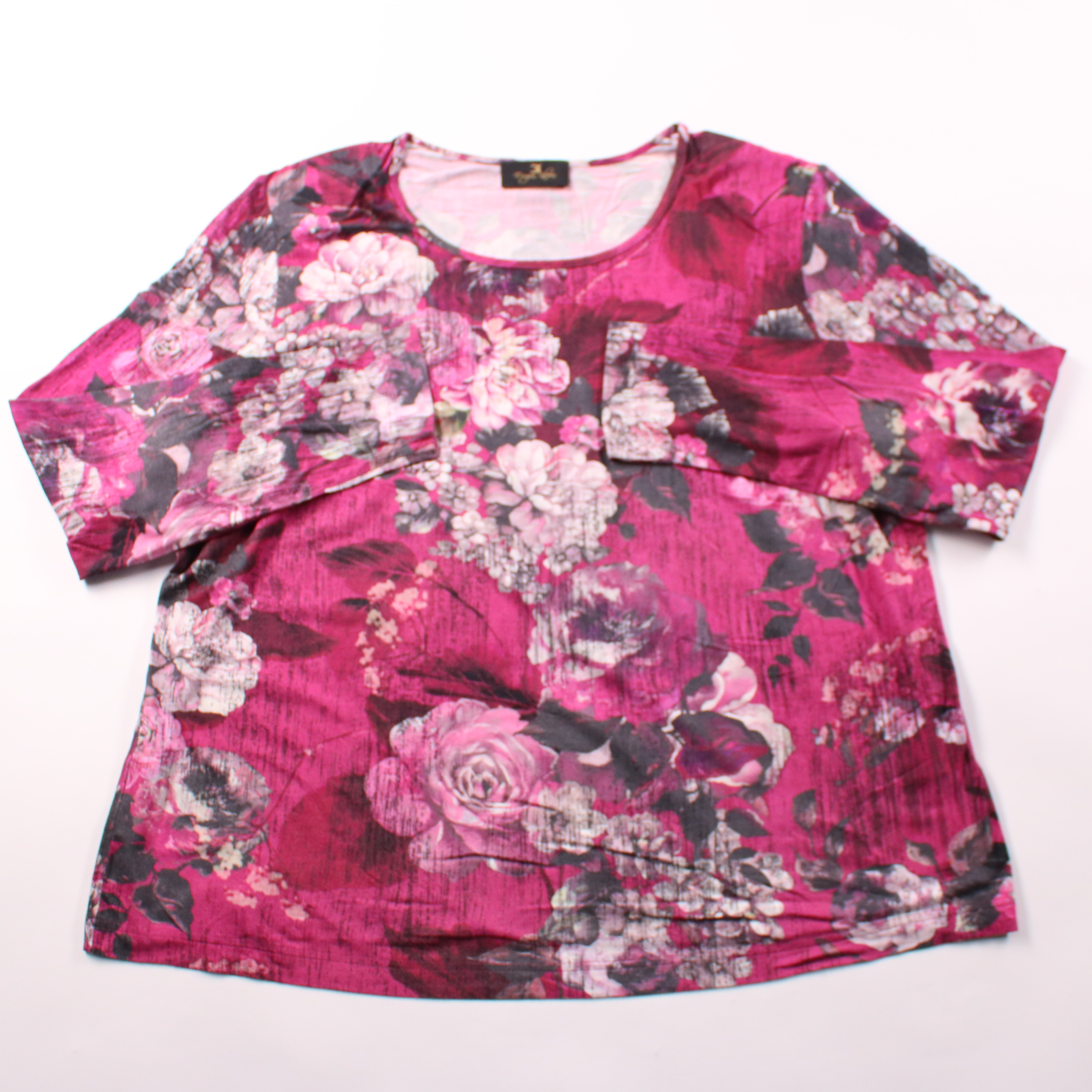 Женская блузка Eugen Klein с ярким цветочным принтом и округлым вырезом, рукав 3/4. Подойдёт для повседневных образов и офиса с однотонным низом. Практичный плюс — мягкий эластичный трикотаж хорошо тянется и комфортно сидит.