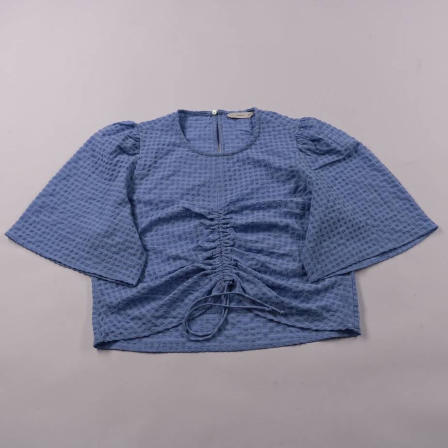 Женская блузка Pigalle голубого цвета из фактурной ткани с кулиской и сборкой по центру. Подойдёт для повседневных образов и на выход, хорошо сочетается с джинсами и юбками. Практичный плюс — эластичный материал комфортно садится по фигуре.