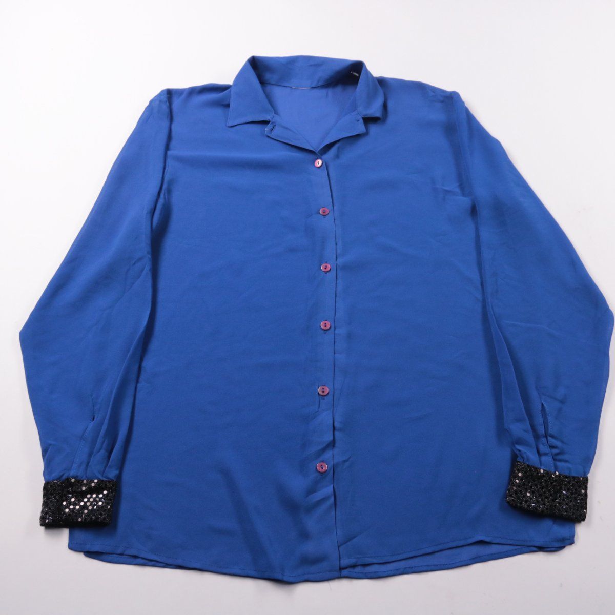 Блузка свободного кроя насыщенного синего цвета с длинным рукавом и манжетами с пайетками. Подойдёт для офиса, встреч и вечерних выходов — красиво смотрится как с брюками, так и с юбкой. Лёгкая ткань приятно носится и почти не занимает места в сумке в поездках.