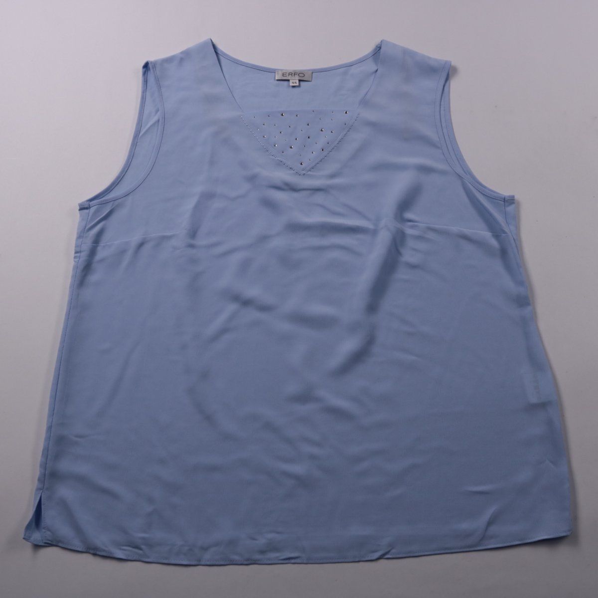 Женская блузка ERFO светло-голубого цвета, без рукавов, с V-образным вырезом и небольшим декором спереди. Подойдёт для лета и тёплой погоды, можно носить как самостоятельно, так и под жакет. Лёгкий полиэстер практически не мнётся и быстро сохнет.