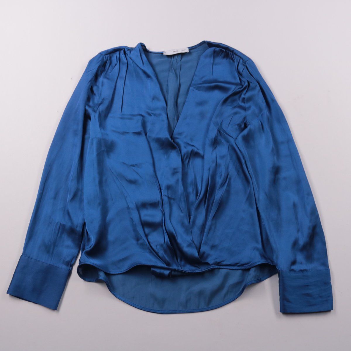 Блузка Mango из гладкой струящейся ткани насыщенного синего цвета, с V-образным вырезом и мягкими сборками у плеч. Подойдёт для офиса и вечерних выходов — красиво смотрится с брюками, юбкой или джинсами. Материал лёгкий и почти не мнётся, удобно носить в течение дня.
