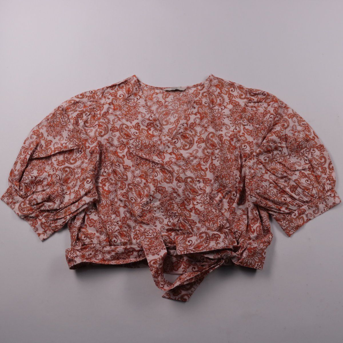 Укороченная блузка George с завязкой спереди и объёмными короткими рукавами. Лёгкий хлопок с принтом пейсли подойдёт для тёплой погоды и повседневных образов. Завязка позволяет регулировать посадку по талии.