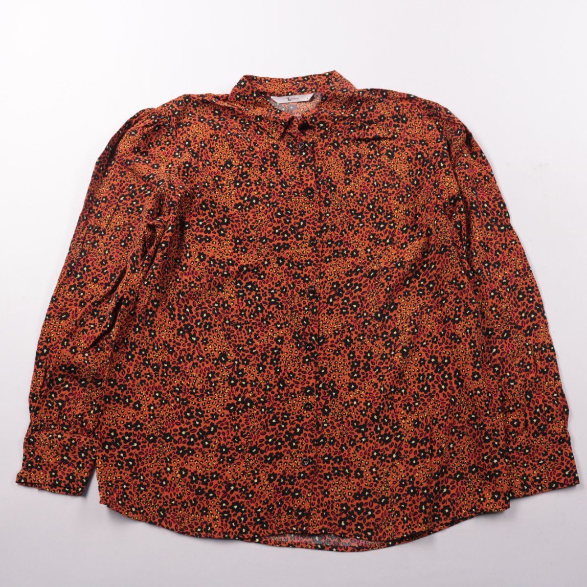 Женская блузка Tu Woman из вискозы с ярким оранжевым принтом и отложным воротником. Подойдёт для офиса и повседневных образов в демисезон, хорошо сочетается с однотонными брюками или джинсами. Лёгкая ткань комфортно носится и быстро сохнет после стирки.