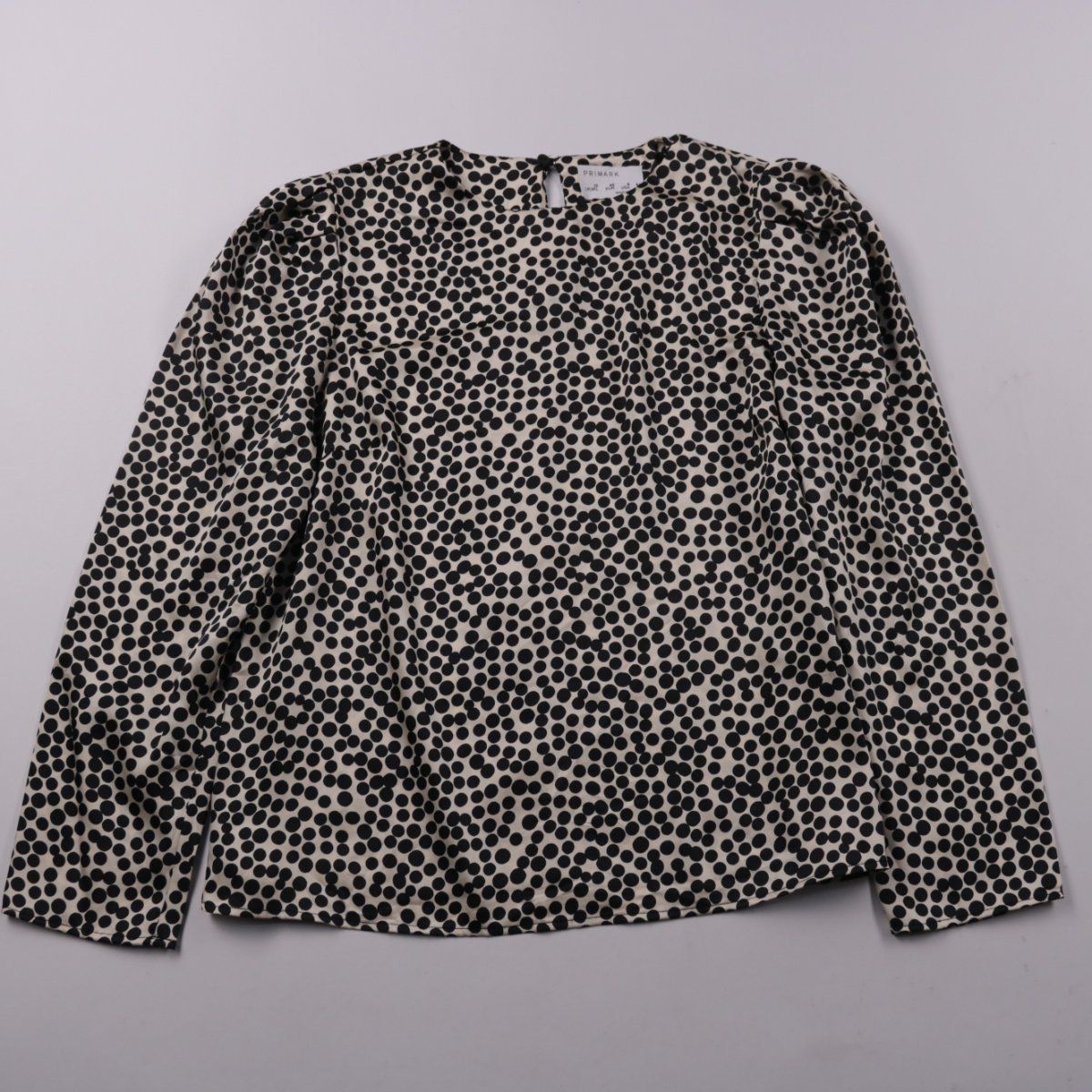 Женская блузка Primark с длинным рукавом и принтом в чёрный горох на светлом фоне. Подойдёт для офиса и повседневных образов, хорошо смотрится как с брюками, так и с юбкой. Практичный плюс — ткань из полиэстера мало мнётся и проста в уходе.