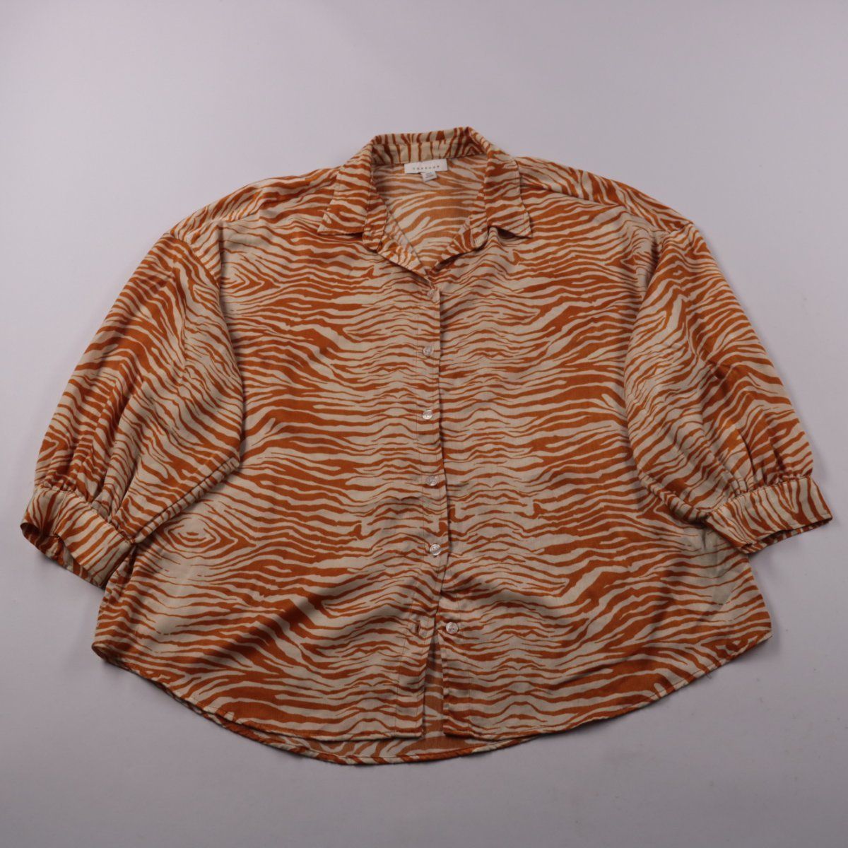 Женская рубашка Topshop с воротником и застёжкой на пуговицы, с принтом под зебру в оранжево-бежевых тонах. Свободный крой подойдёт для повседневных образов и отпуска, хорошо смотрится навыпуск. Полиэстеровая ткань практична в уходе и быстро сохнет.