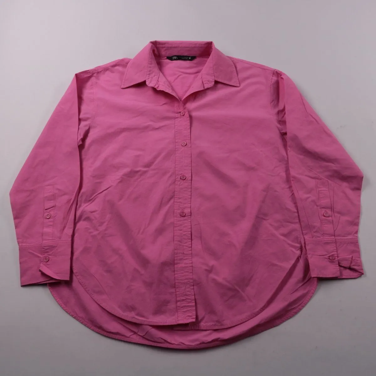 Женская рубашка Zara ярко-розового цвета с классическим отложным воротником и застёжкой на пуговицы. Подойдёт для офиса и повседневных образов, удобно носить как самостоятельный верх или вторым слоем. Натуральный хлопок хорошо дышит и комфортен в течение дня.