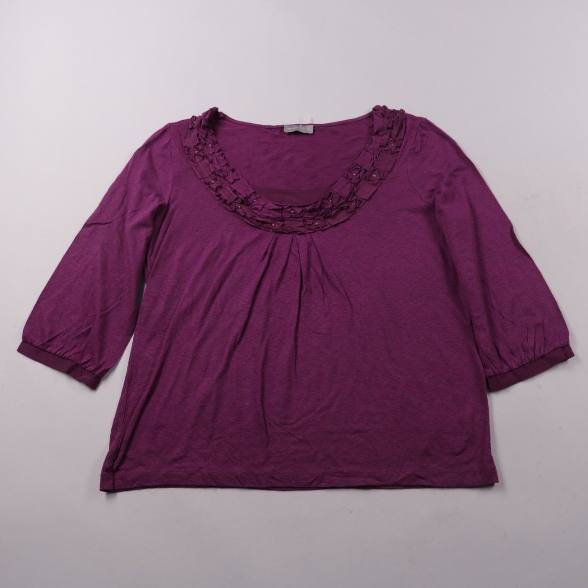 Блузка Per Una фиолетового цвета из мягкого трикотажа с декоративной отделкой по вырезу и защипами спереди. Подойдёт для повседневных образов и офиса с кардиганом или жакетом. Комфортна в носке и почти не сковывает движения за счёт эластичной ткани.