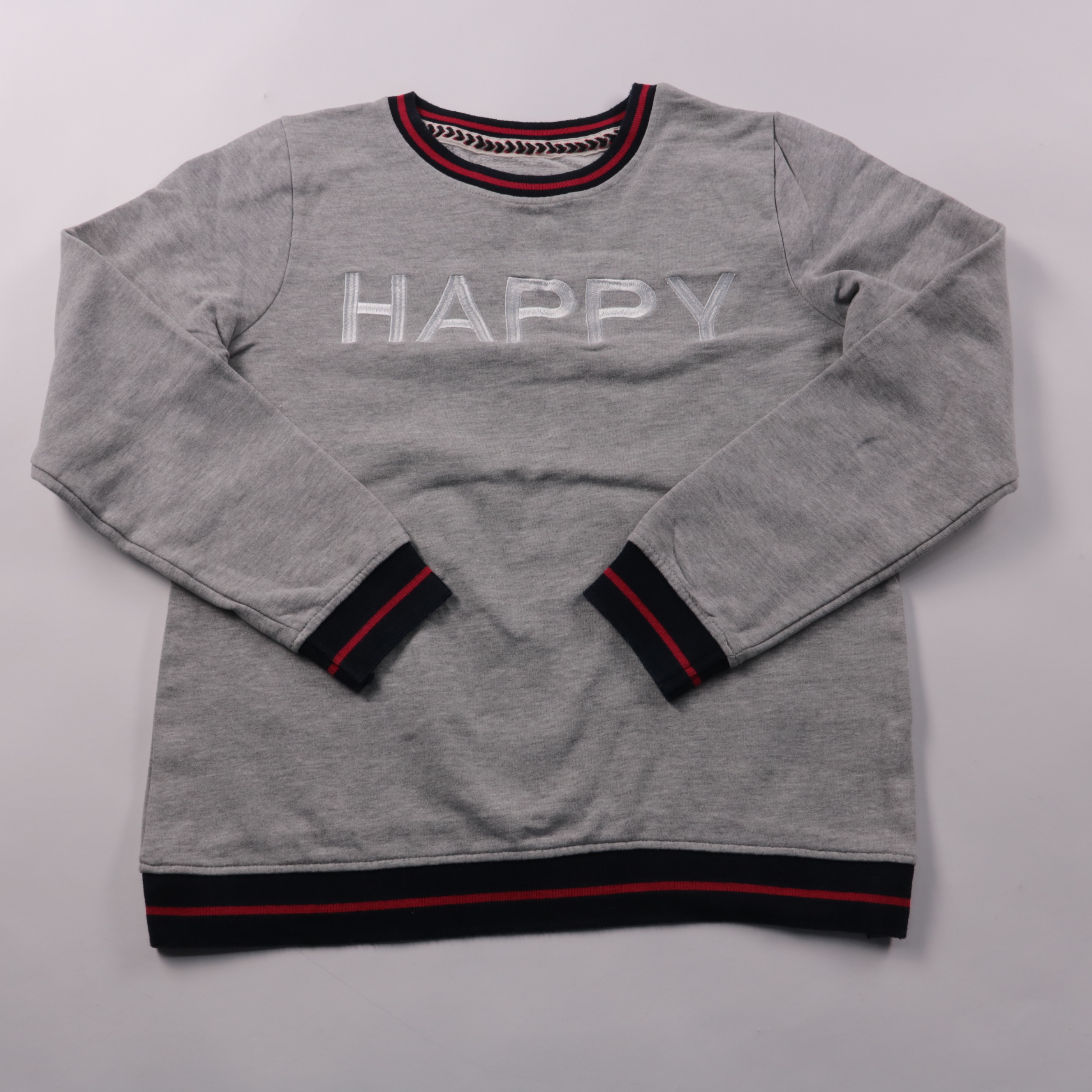 Свитшот Marie Lund из серого хлопкового трикотажа с вышитой надписью HAPPY и контрастными манжетами. Подойдёт для повседневных образов и прогулок в прохладную погоду, хорошо сочетается с джинсами и спортивными брюками. Мягкая изнанка делает его комфорт...