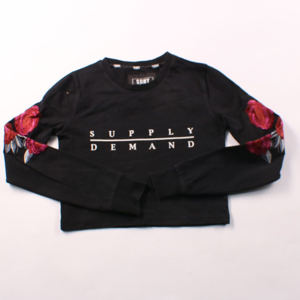 Чёрный свитшот SDNY (Supply & Demand) с принтом и вышивкой роз на рукавах. Подойдёт для повседневных образов и прогулок, хорошо сочетается с джинсами и юбками. Плотный трикотаж комфортно сидит и не сковывает движения.