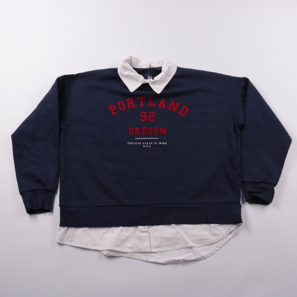Женский свитшот F&F тёмно-синего цвета с принтом «Portland Oregon» и декоративным белым воротником/низом под рубашку. Подойдёт для повседневных образов и учебы/прогулок в прохладную погоду. Мягкая изнанка и свободный крой делают его удобным для носки и...