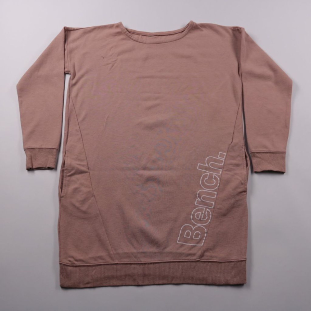 Свитшот Bench. пудрово-розового цвета с круглым вырезом и фирменным принтом сбоку. Подойдёт для повседневных образов и дома, легко сочетается с джинсами и леггинсами. Практичен благодаря мягкому трикотажу и удобным манжетам.