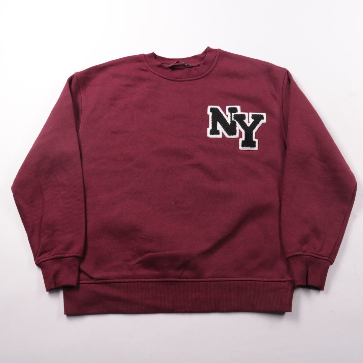 Свитшот Dunnes бордового цвета с нашивкой «NY» на груди и круглым вырезом. Подойдёт для повседневной носки и прогулок в прохладную погоду, легко сочетается с джинсами и спортивными брюками. Ткань с высоким содержанием хлопка приятна к телу и проста в уходе.