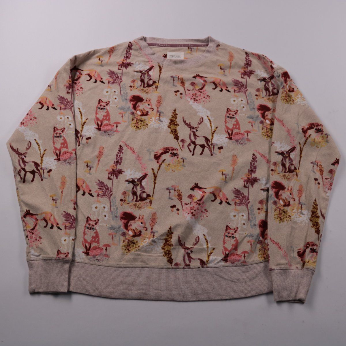Свитшот Next с круглым вырезом и принтом с лесными животными в спокойной бежевой гамме. Подойдёт для прогулок и повседневных образов в прохладную погоду, хорошо сочетается с джинсами и однотонными брюками. Лёгкий материал быстро сохнет и прост в уходе.