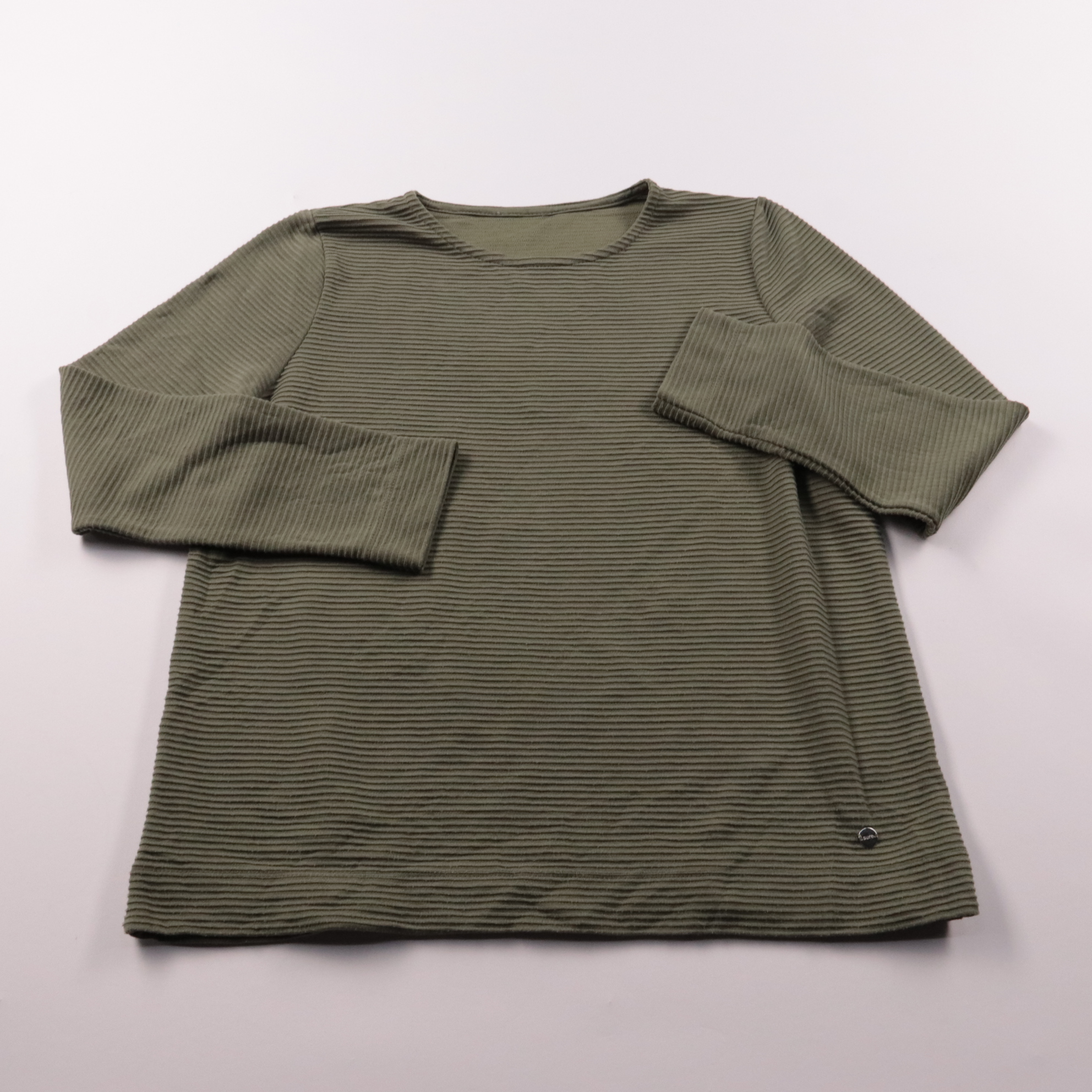 Женский лонгслив в цвете хаки из фактурного трикотажа в мелкий рубчик. Подойдёт для повседневной носки и как базовый слой под жакет или куртку в прохладную погоду. Ткань тянется и комфортно садится по фигуре, рукава можно носить с подворотом.