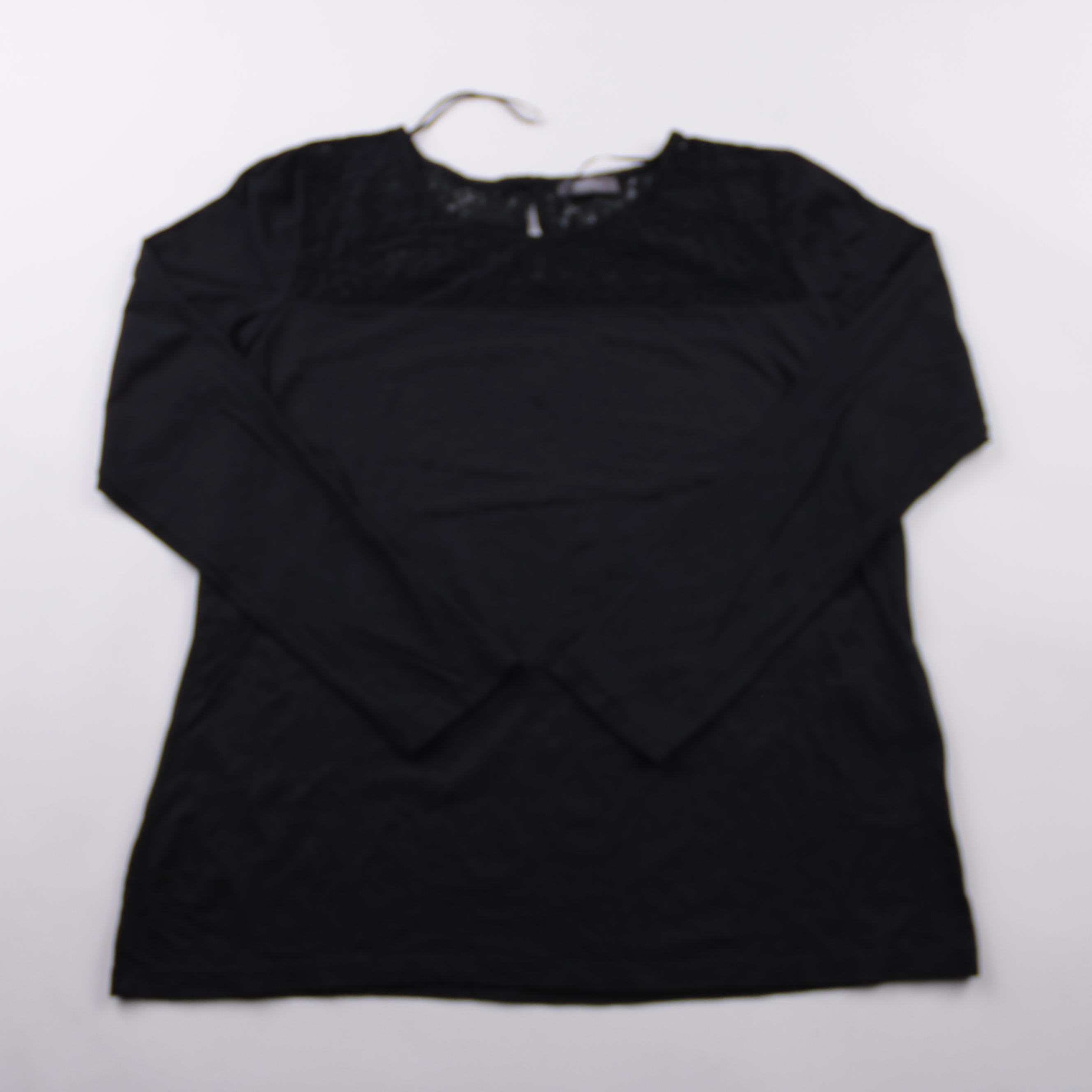 Женский чёрный лонгслив Yessica с кружевной отделкой по линии выреза. Подойдёт для повседневных образов и как базовый слой под жакет или кардиган. Мягкий трикотаж с модалом приятен к телу и хорошо тянется.