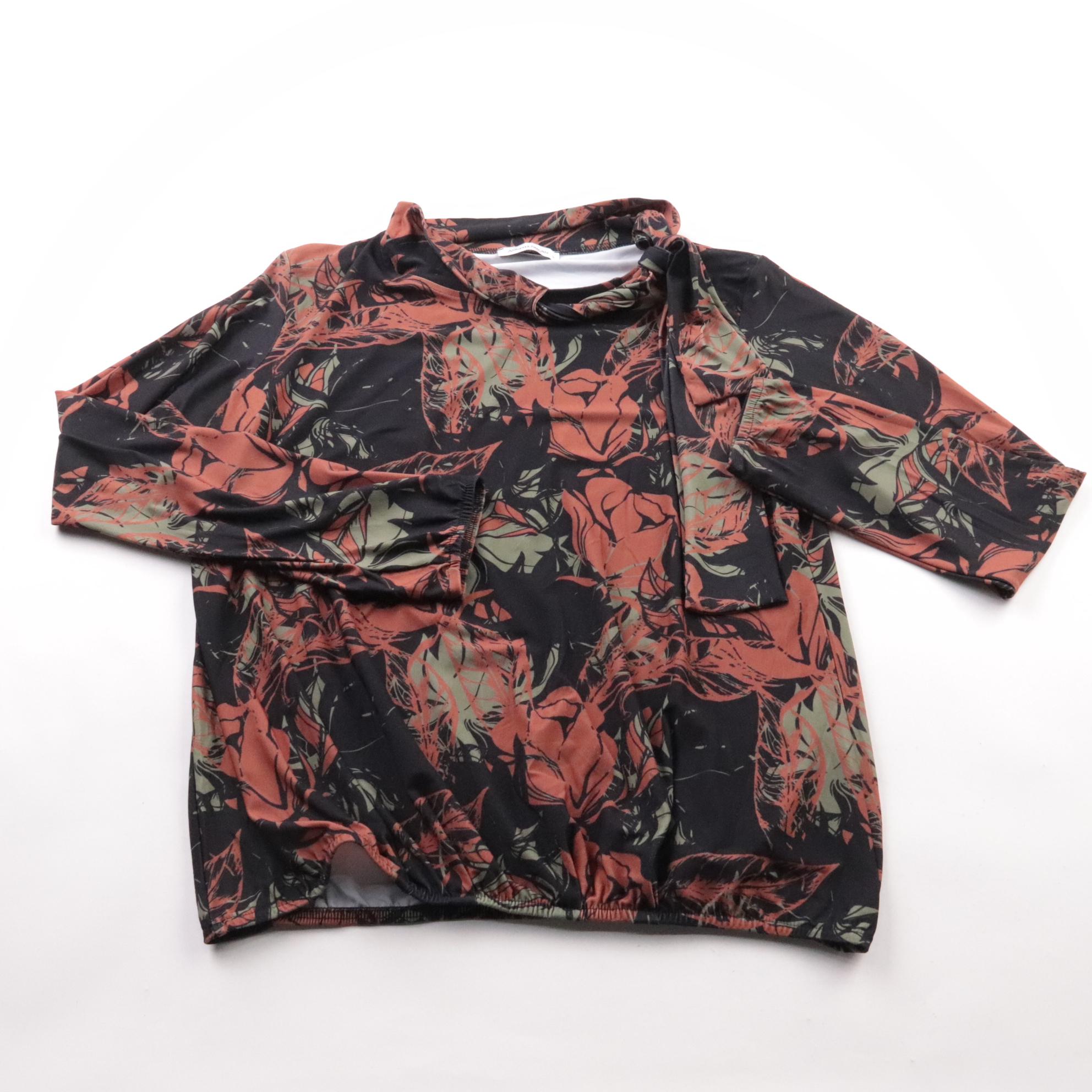 Лонгслив Angelle Milan с ярким принтом и завязкой у горловины. Подойдёт для повседневных образов и в офис с базовыми брюками или юбкой. Эластичная ткань хорошо тянется и комфортно садится по фигуре.