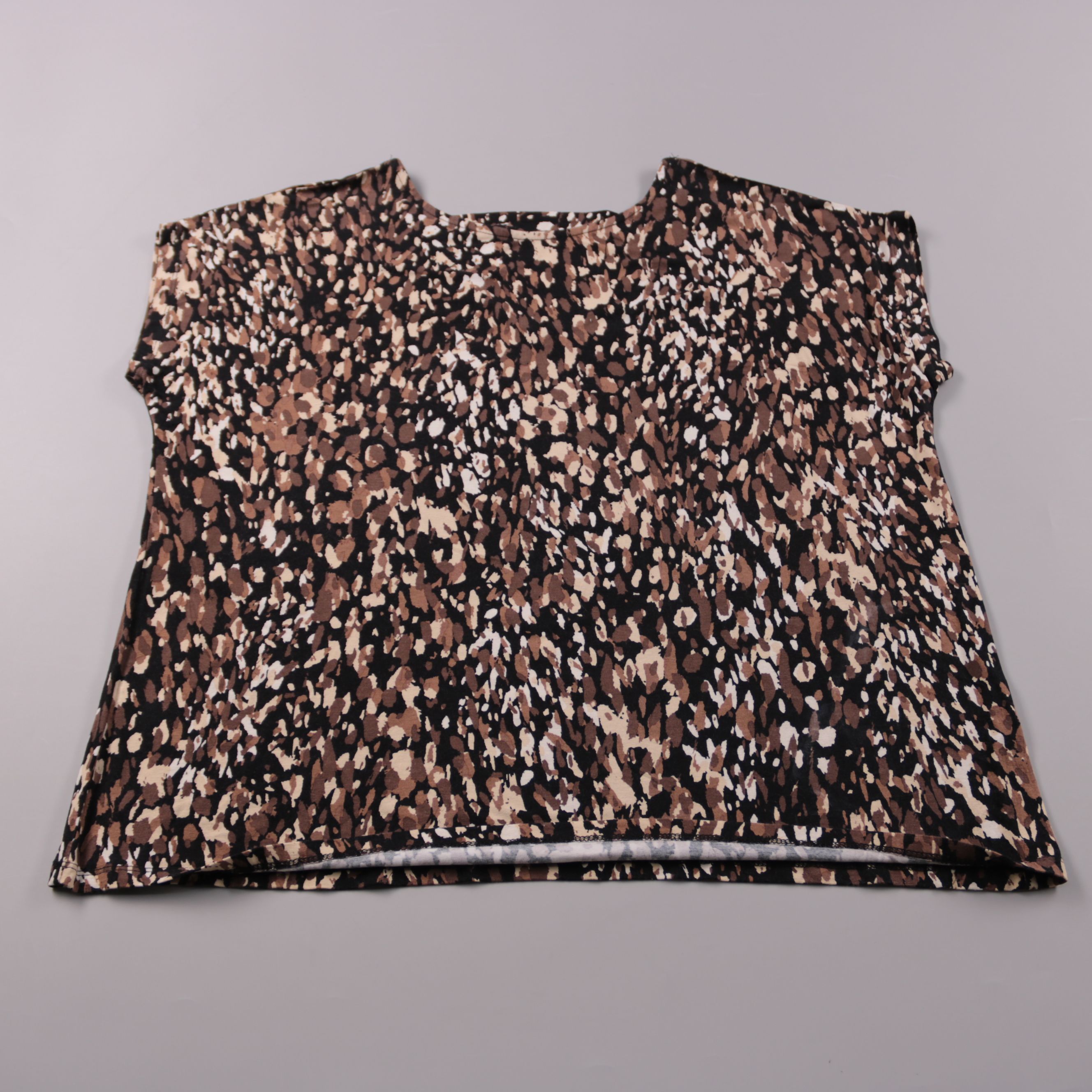Женская футболка с абстрактным пятнистым принтом в коричнево-бежевых тонах на чёрном фоне. Подойдёт для повседневных образов с джинсами или однотонными брюками и юбками. Лёгкий материал и свободная посадка делают её удобной на каждый день.