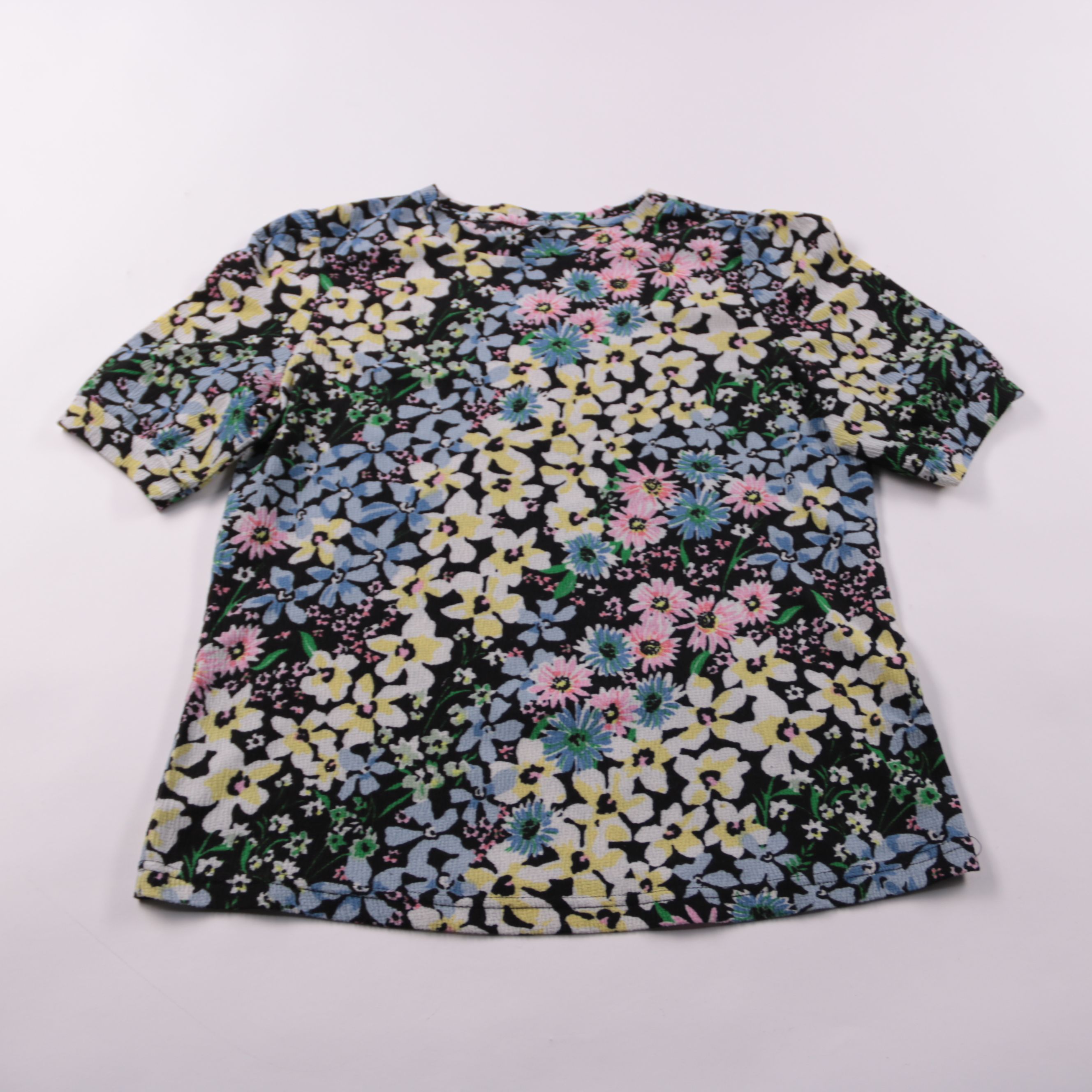 Женский топ Only с цветочным принтом на тёмной основе и короткими рукавами. Подойдёт для летних прогулок и повседневных образов с джинсами или юбкой. Материал тянется и почти не мнётся, удобно носить весь день.