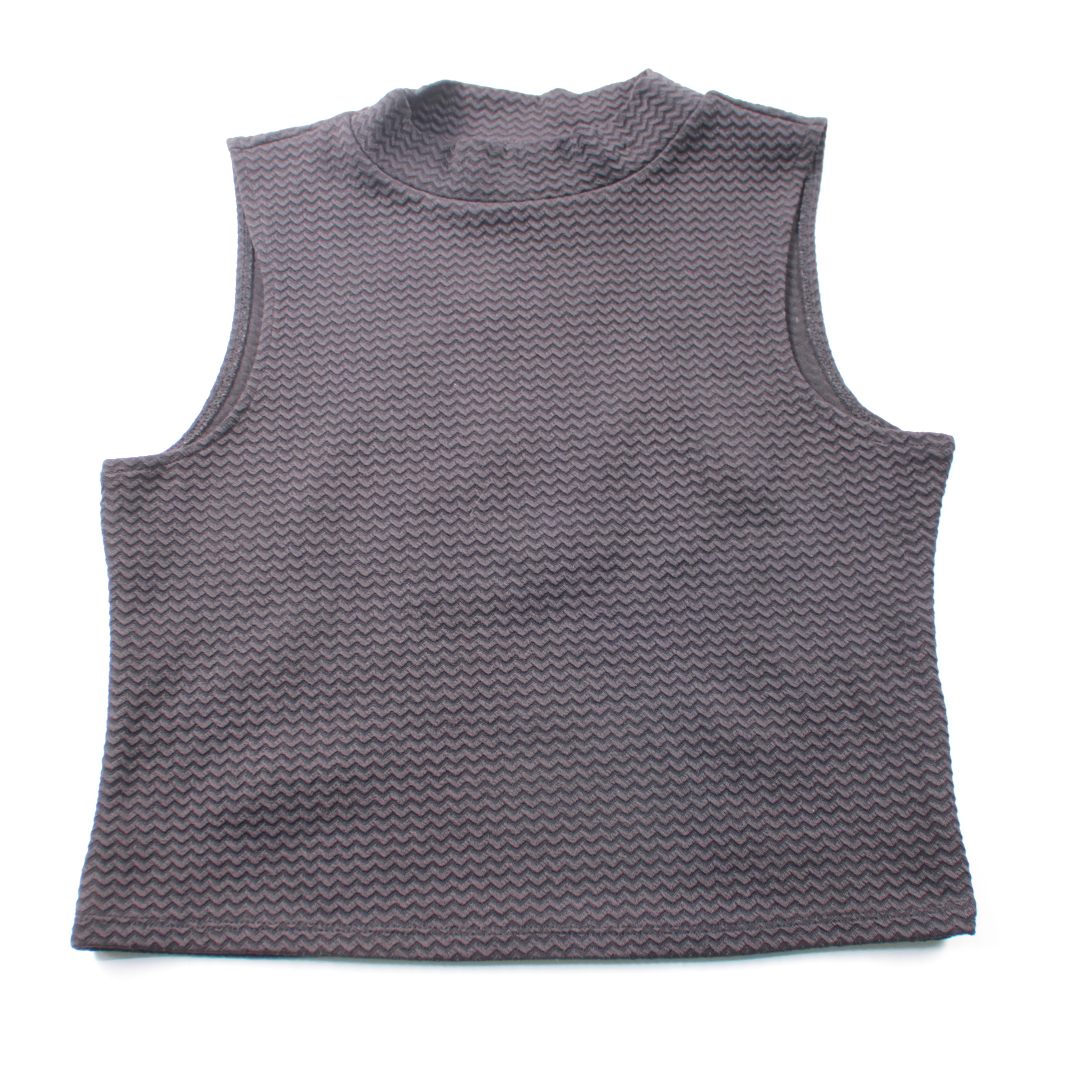 Топ H&M без рукавов с высокой горловиной и фактурной тканью с мелким зигзагом. Подойдёт для повседневных образов и как базовый слой под жакет или кардиган. Практичен тем, что эластичный материал хорошо тянется и комфортно садится по фигуре.