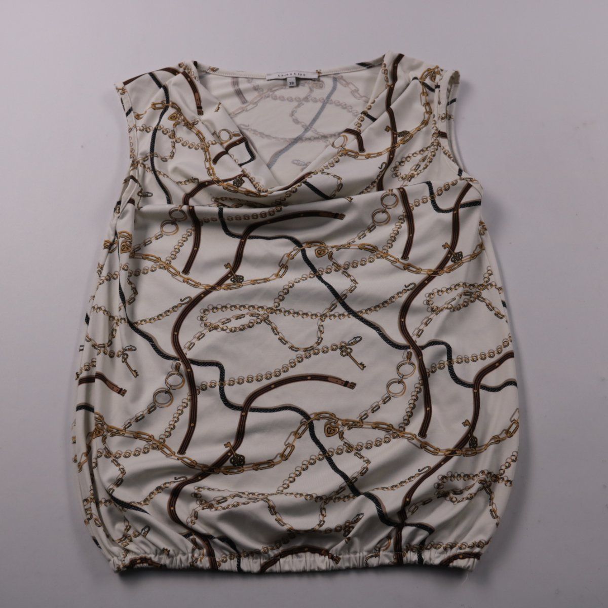 Топ Lala & Liza с драпировкой по горловине и принтом с цепочками на светлом фоне. Подойдёт для лета и тёплой погоды, легко сочетается с джинсами или юбкой в повседневных и городских образах. Практичное преимущество — мягкая эластичная ткань и резинка по низу, благодаря которым топ комфортно сидит.
