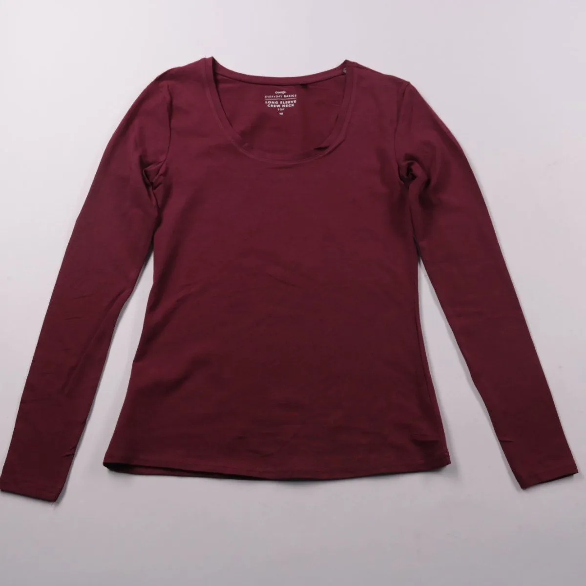 Женский лонгслив George Everyday Basics бордового цвета с круглым вырезом и длинным рукавом. Подойдёт для повседневной носки и как базовый слой в прохладную погоду. Ткань с добавлением эластана слегка тянется и комфортно садится по фигуре.