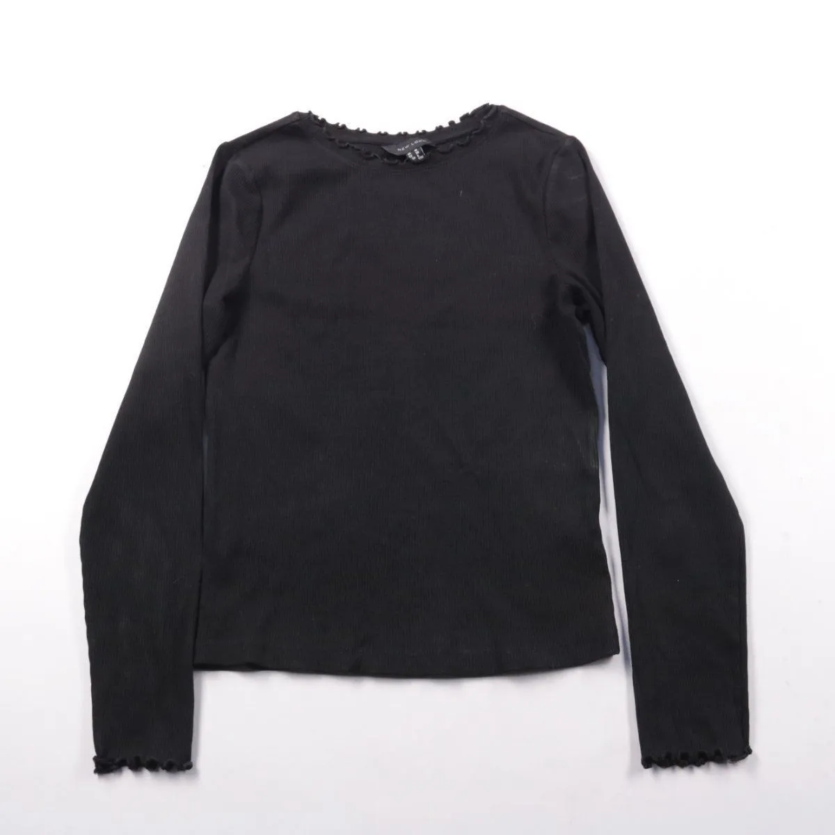 Чёрный лонгслив New Look из рифлёного трикотажа с волнистой обработкой по горловине и манжетам. Подойдёт для повседневных образов и как базовый слой в прохладную погоду. За счёт добавления эластана ткань тянется и комфортно садится по фигуре.
